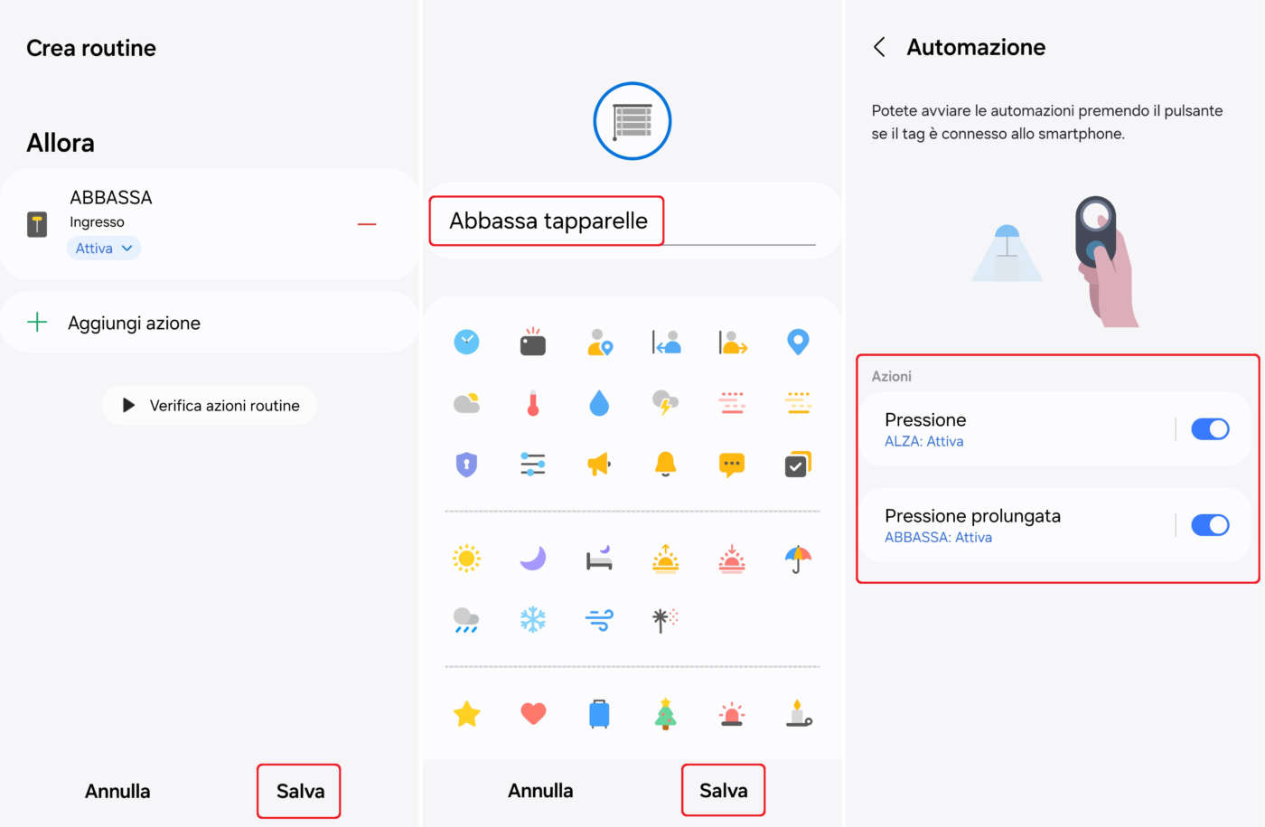 - Cliccate su Fatto, controllate che l’azione appena registrata compaia nella scheda Automazioni, cliccate su Salva, date un nome all’azione (es.: abbassa tapparelle) e cliccate ancora su Salva per terminare. Dopo qualche secondo lo SmartTag 2 emetterà un bip di conferma.