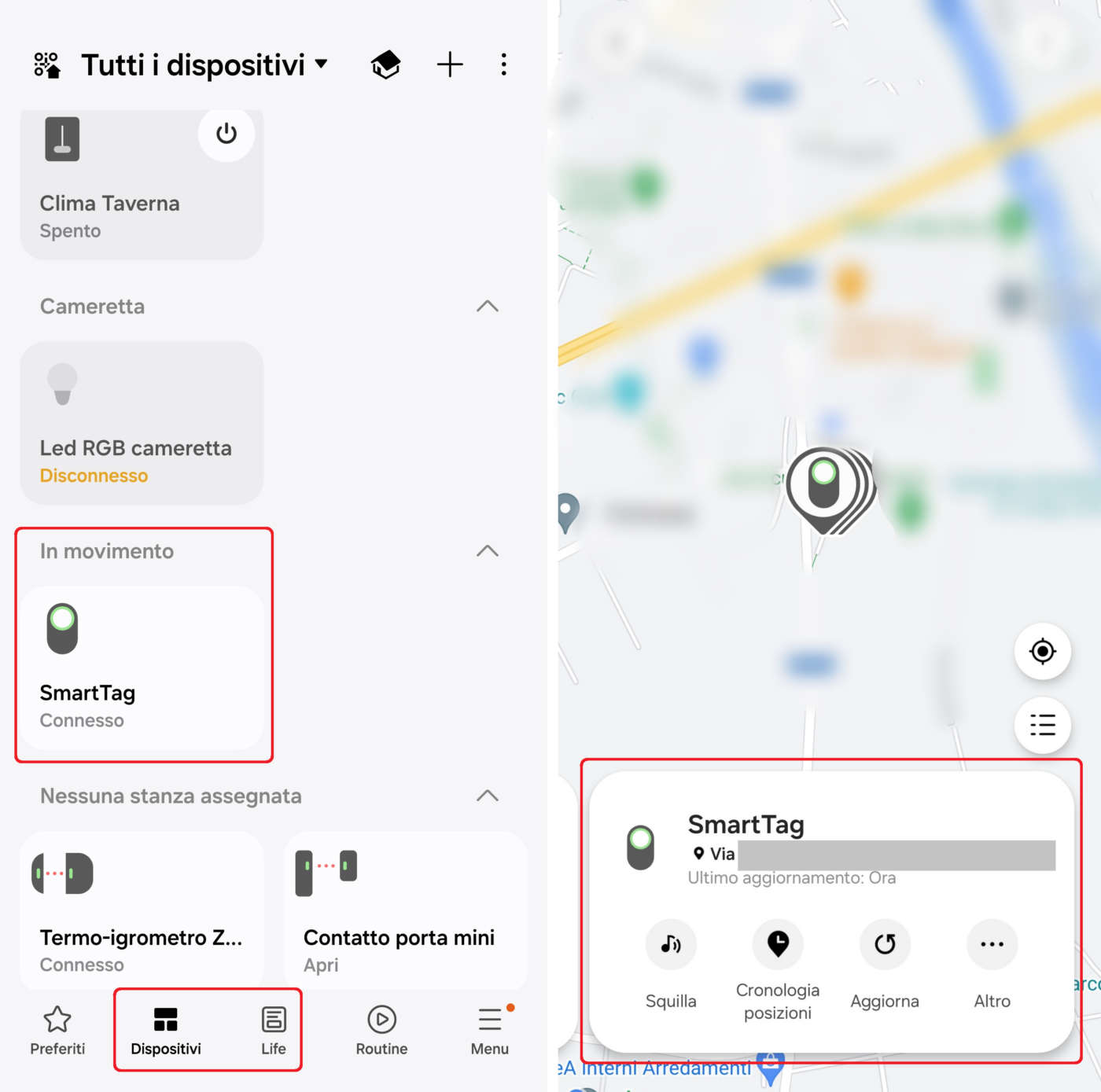Per utilizzare le funzionalità dello SmartTag 2 basta selezionarlo nella scheda Dispositivi (gruppo In movimento) oppure in Life/Find.