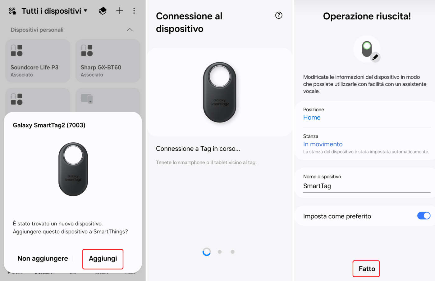 La procedura di registrazione è semplice e veloce: basta accendere il Bluetooth sullo smartphone Galaxy, tirare la pellicola azzurra di protezione della batteria e attendere la comparsa del pop-up di rilevazione automatica come spiegato nel manuale d’uso scaricabile anche da qui in formato PDF. Cliccate su Aggiungi e seguite le istruzioni sullo schermo.