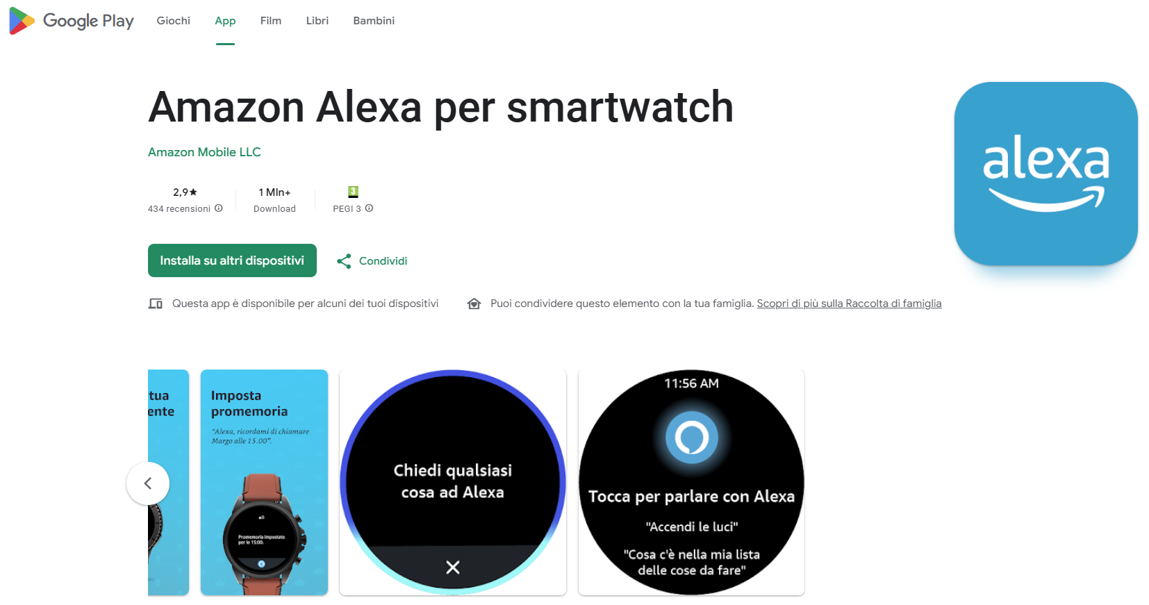 Come è facile immaginare non si tratta della versione Wear OS della ben nota app Alexa per smartphone e tablet con i vari controlli domotici, routine e altre funzionalità (lista della spesa, promemoria, sveglie e timer, comunicazioni, ecc.).