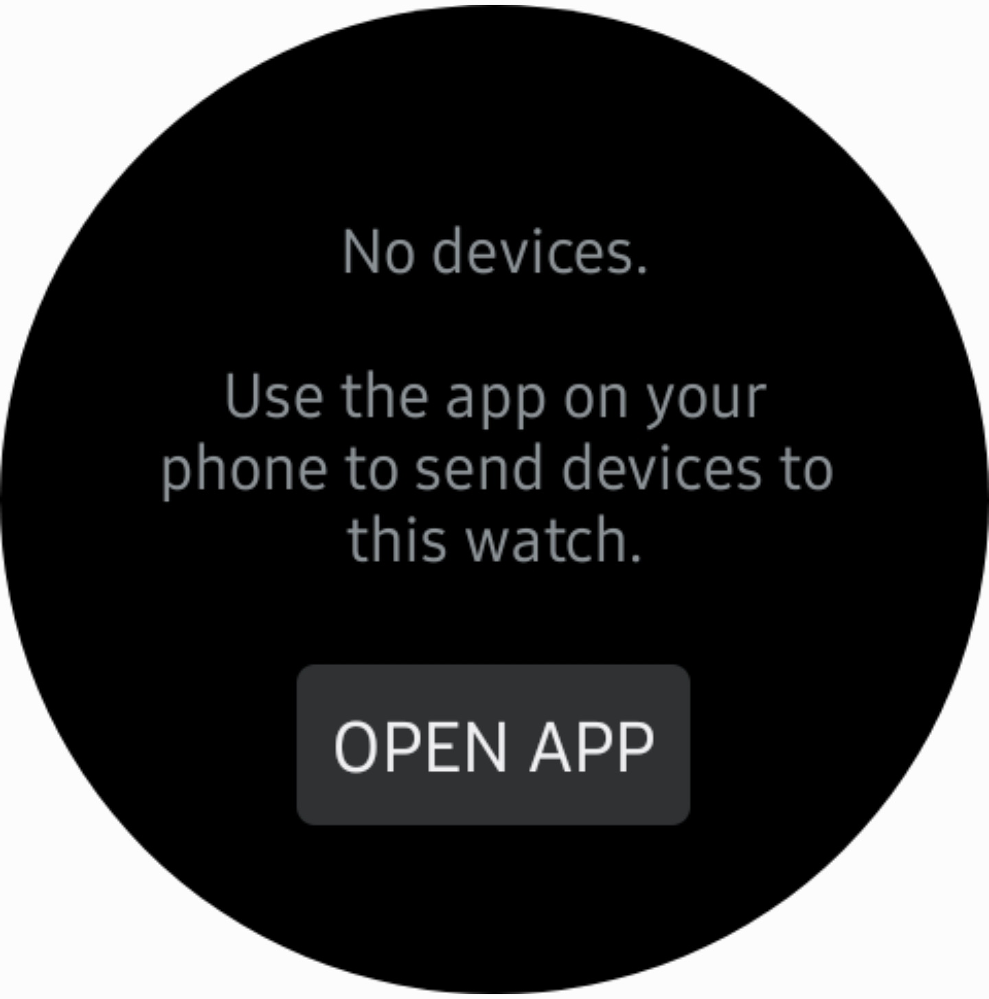 Aprite la app sull’orologio e quando appare la schermata “No devices” cliccate su Open App per aprire la app sullo smartphone.