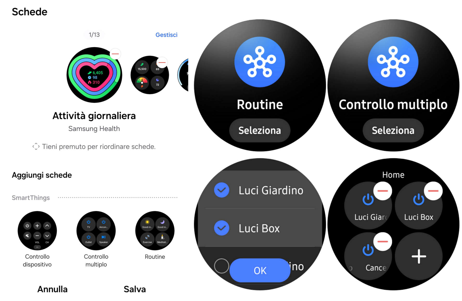 Quando lo smartwatch è connesso allo smartphone (tramite Bluetooth), ad una rete Wi-Fi (casa, ufficio, Wi-Fi pubblico, ecc.) oppure ad una rete mobile 4G (solo smartwatch con LTE come questo) basta toccare l’icona del dispositivo smart, il singolo comando oppure la routine per attivarli e disattivarli.
