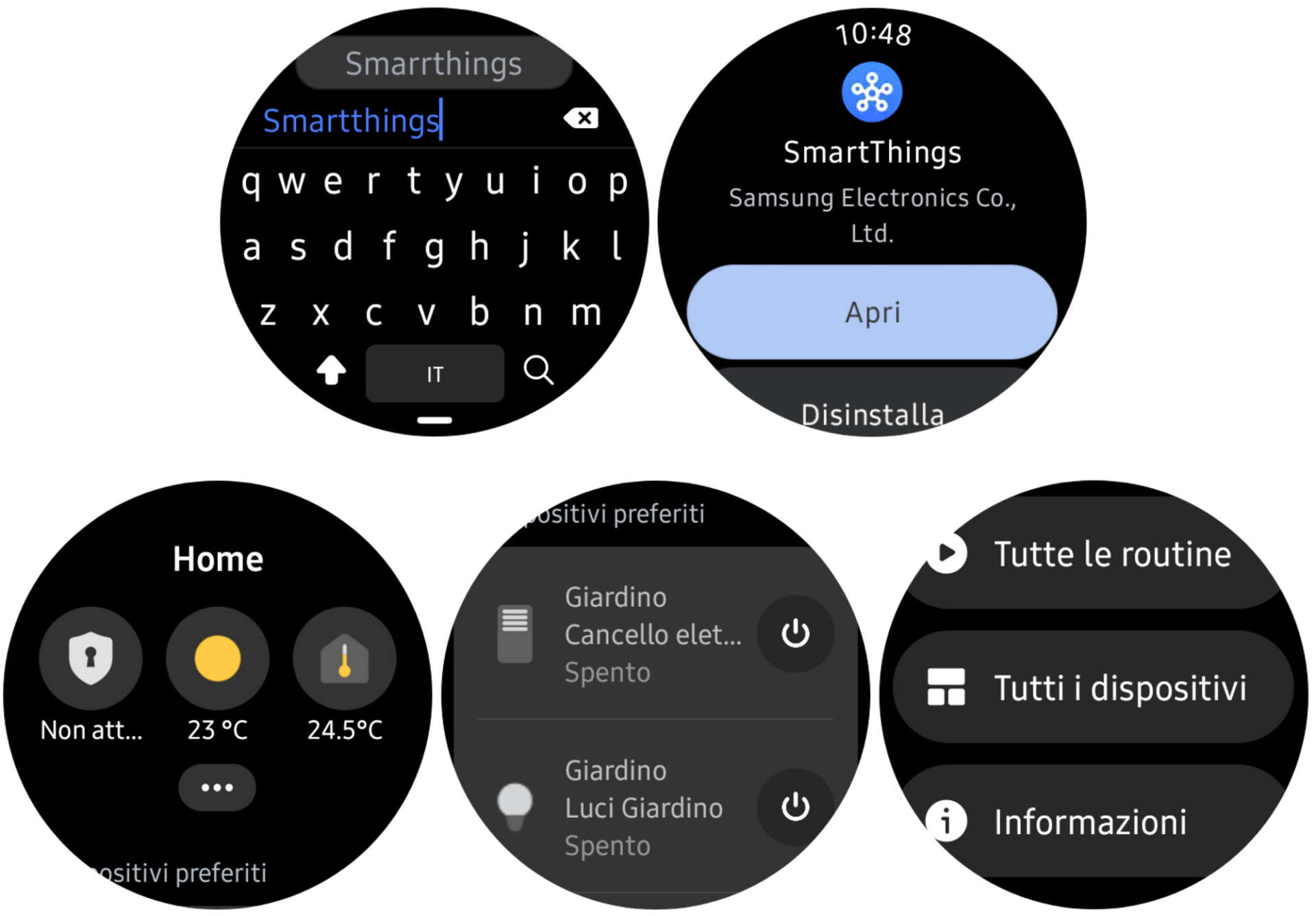 A questo punto basta installare la app sullo smartwatch Wear OS (tramite Google Play o Galaxy Store) e lanciarla per ritrovare gli stessi dispositivi e quasi tutte le voci della app anche sul display dell’orologio.