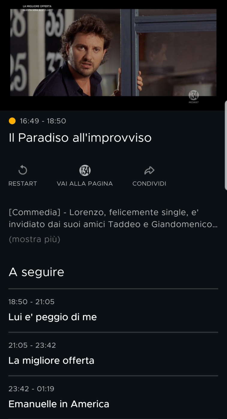 Se siete interessati ai contenuti on demand consigliamo di registrarvi gratuitamente per usufruire del servizio Offerta Personalizzata che mostra i contenuti più interessanti in linea con le preferenze di navigazione, permette di salvare i titoli preferiti per rivederli in un secondo momento (anche offline ma solo tramite app mobile e per alcuni contenuti), riprendere la visione di un video iniziato e conservare lo storico dei contenuti visualizzati.