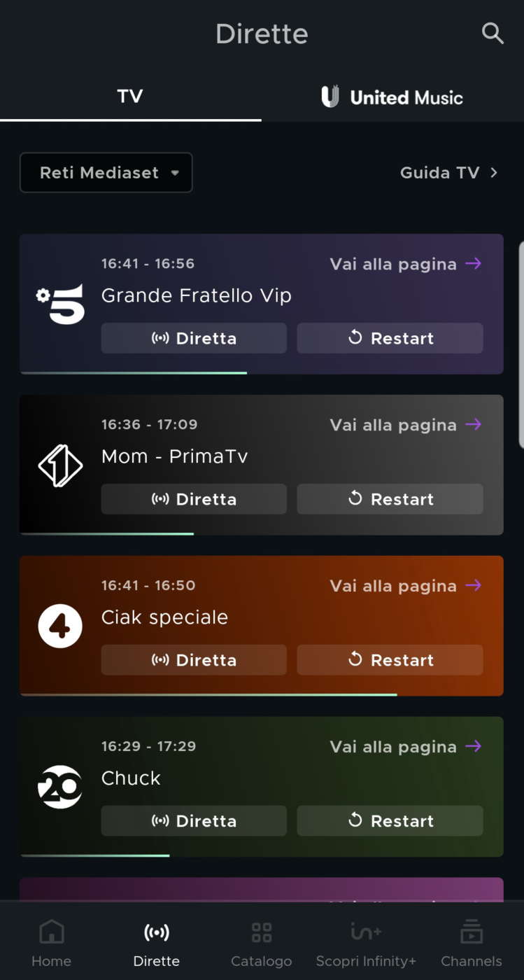 Anche Mediaset Infinity (ex Mediaset Play) è disponibile su web, app Android/iOS, Smart Tv e decoder interattivi con una offerta gratuita e a pagamento (Infinity) in live streaming e on demand (programmi tv, film, serie, talk show, reality, documentari, cartoni, ecc.).