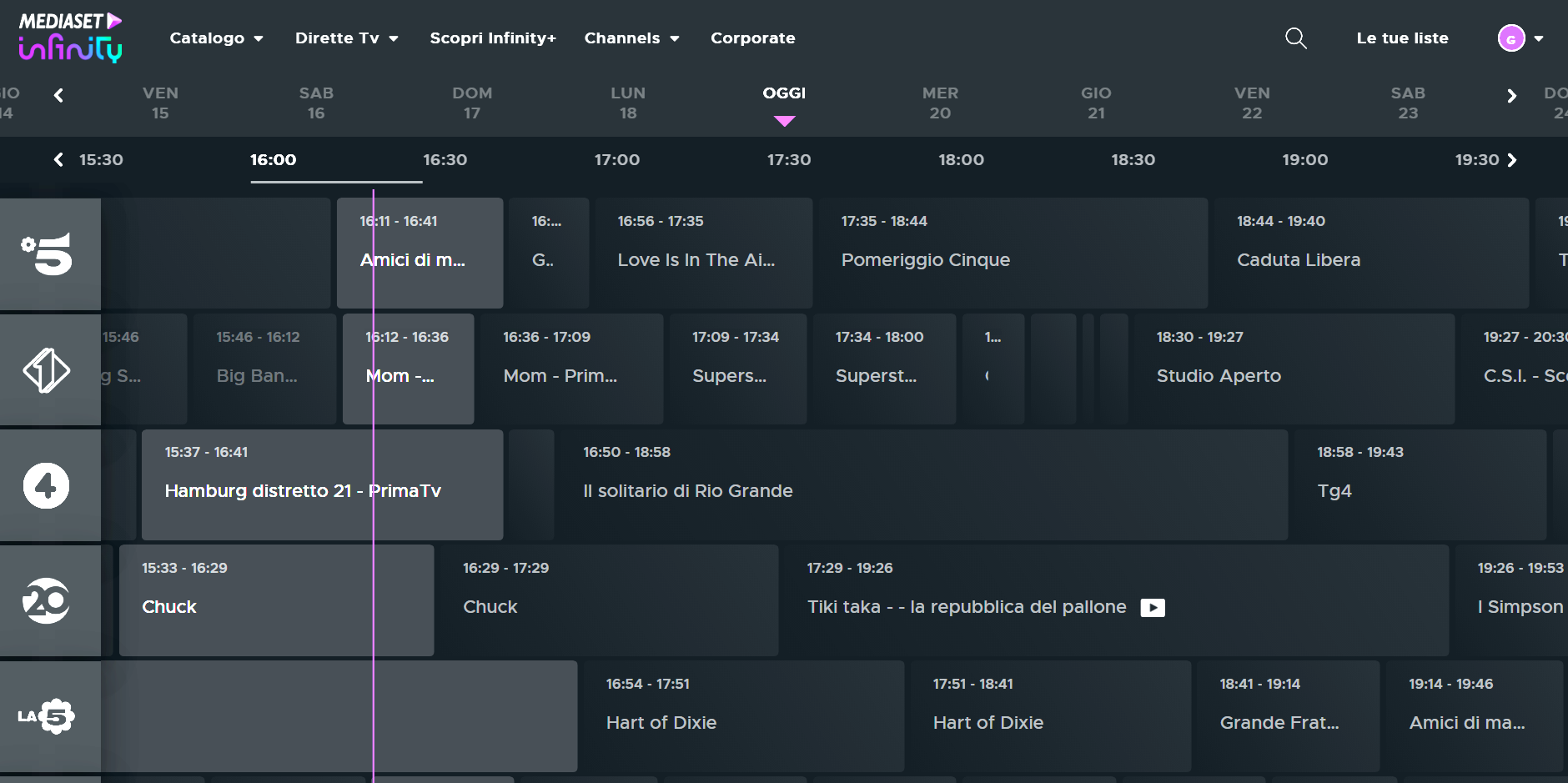 Anche qui troviamo la griglia della guida ai programmi con i canali televisivi e i contenuti trasmessi durante la giornata accompagnati da una breve descrizione e dal link per la visione live.
