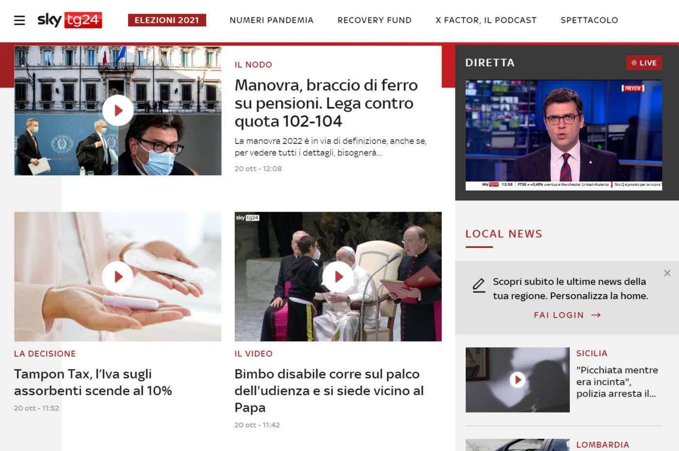 Sul sito web di Sky TG24 ma anche sulla app per dispositivi Android e iOS è possibile seguire la diretta del più famoso canale all-news italiano, gratuitamente anche per chi non è abbonato a Sky su DTT, SAT oppure Fibra.