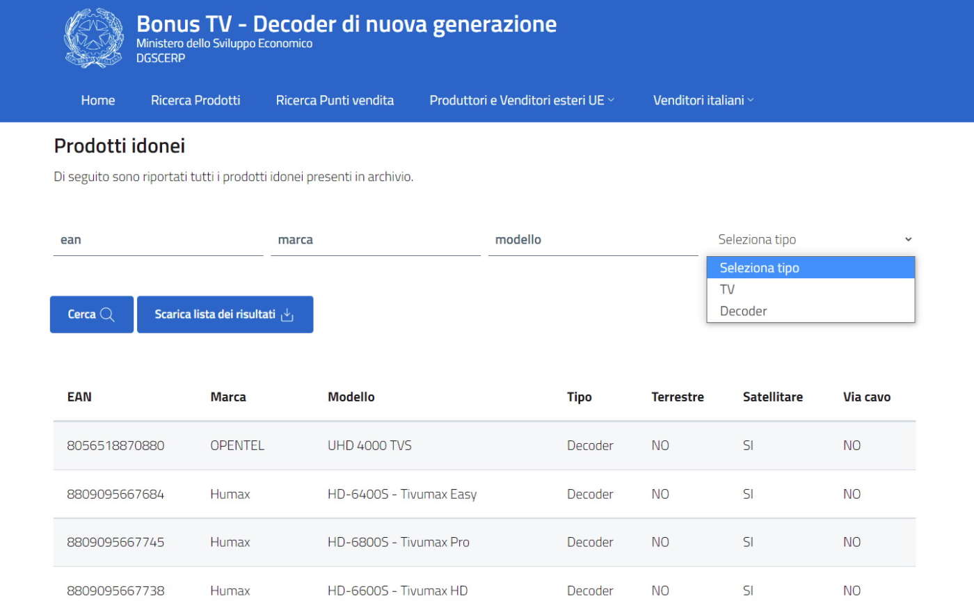 Elenco ufficiale dei prodotti idonei per i Bonus Tv con motore di ricerca, filtro tipologia (Tv/decoder) e altri strumenti utili