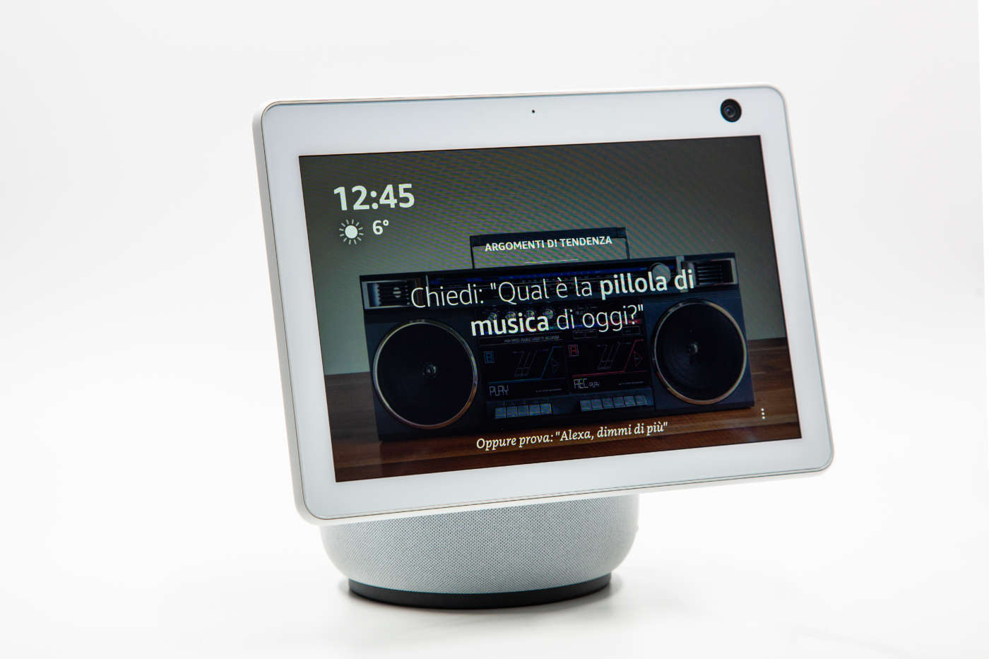 Il nuovo Echo Show 10 rende l’interazione con Alexa ancora più naturale: il dispositivo ruota in modo automatico per essere sempre rivolto verso chi lo sta utilizzando. Costa 250 euro.