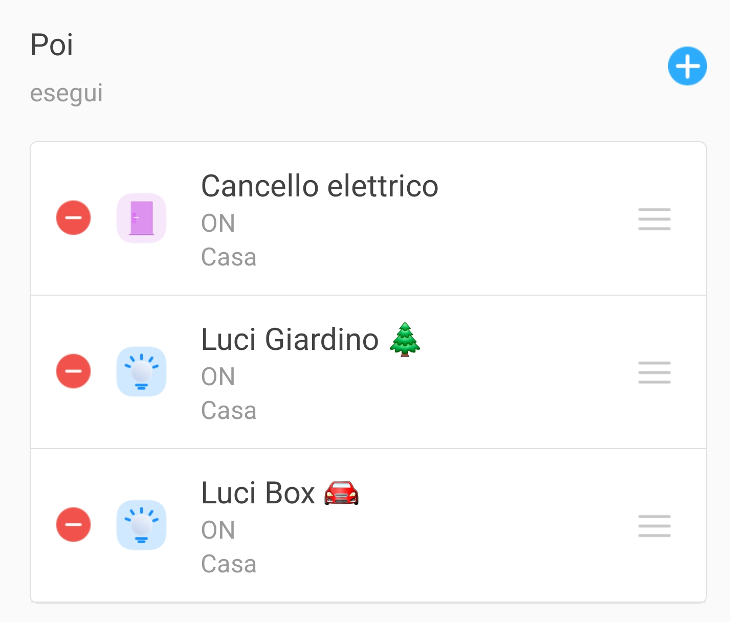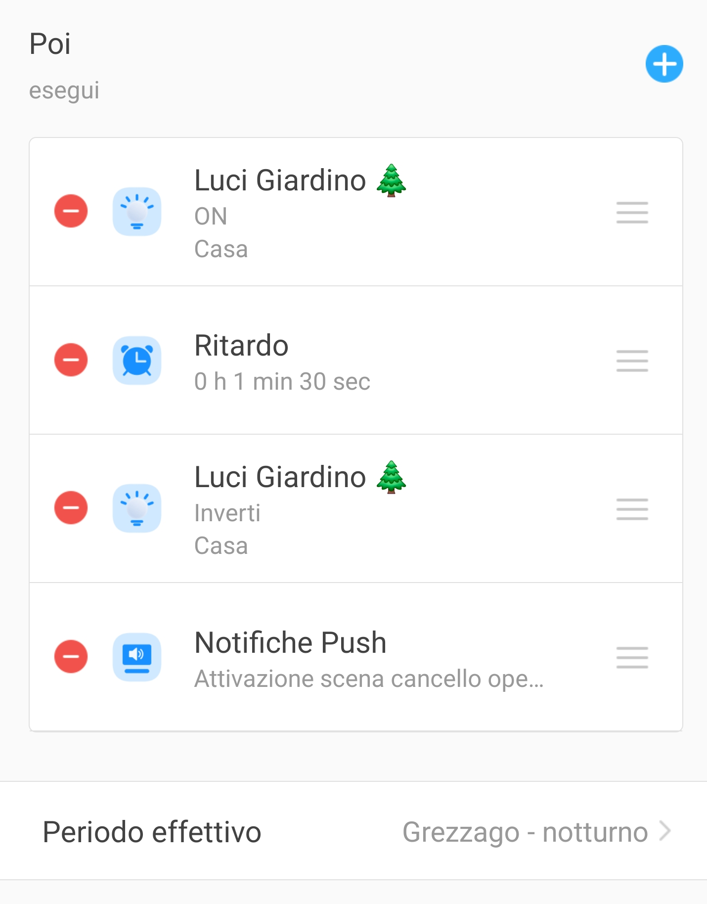 1. Dopo avere inserito e personalizzato le azioni cliccate su Salva e controllate che la schermata principale della scena appena creata contenga i comandi che avete appena selezionato. Per ordinare cronologicamente i comandi da eseguire cliccate sulle tre linee a destra e trascinateli sopra o sotto;
