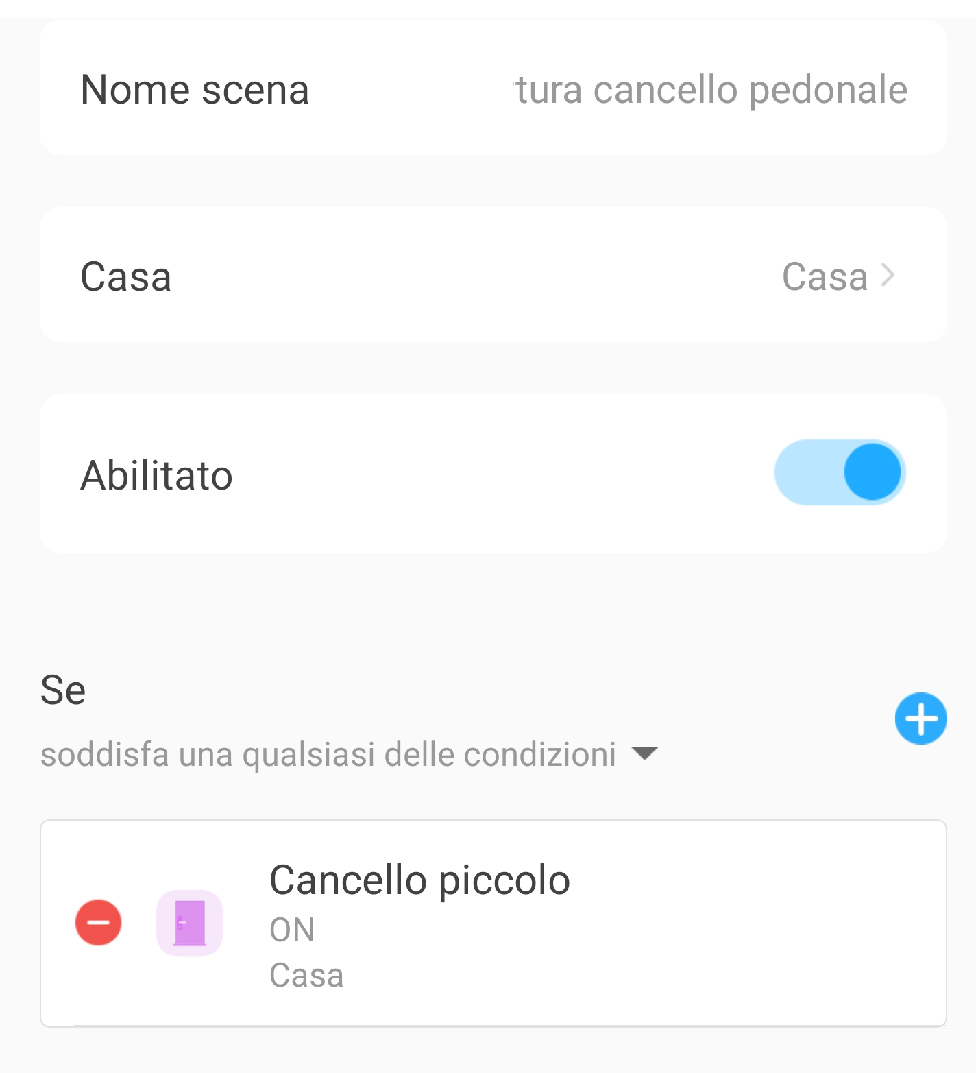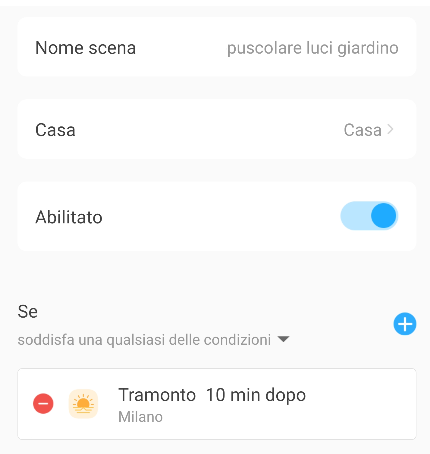 Questo scenario accende automaticamente le luci del cortile di casa quando si attiva l’apertura del cancello pedonale e solo di sera-notte (tramonto-alba), le mantiene accese per 2 minuti (timer) e poi le spegne. Tutti i dispositivi interessati devono essere già domotizzati con smart switch, plug, lampadine led smart, ecc.