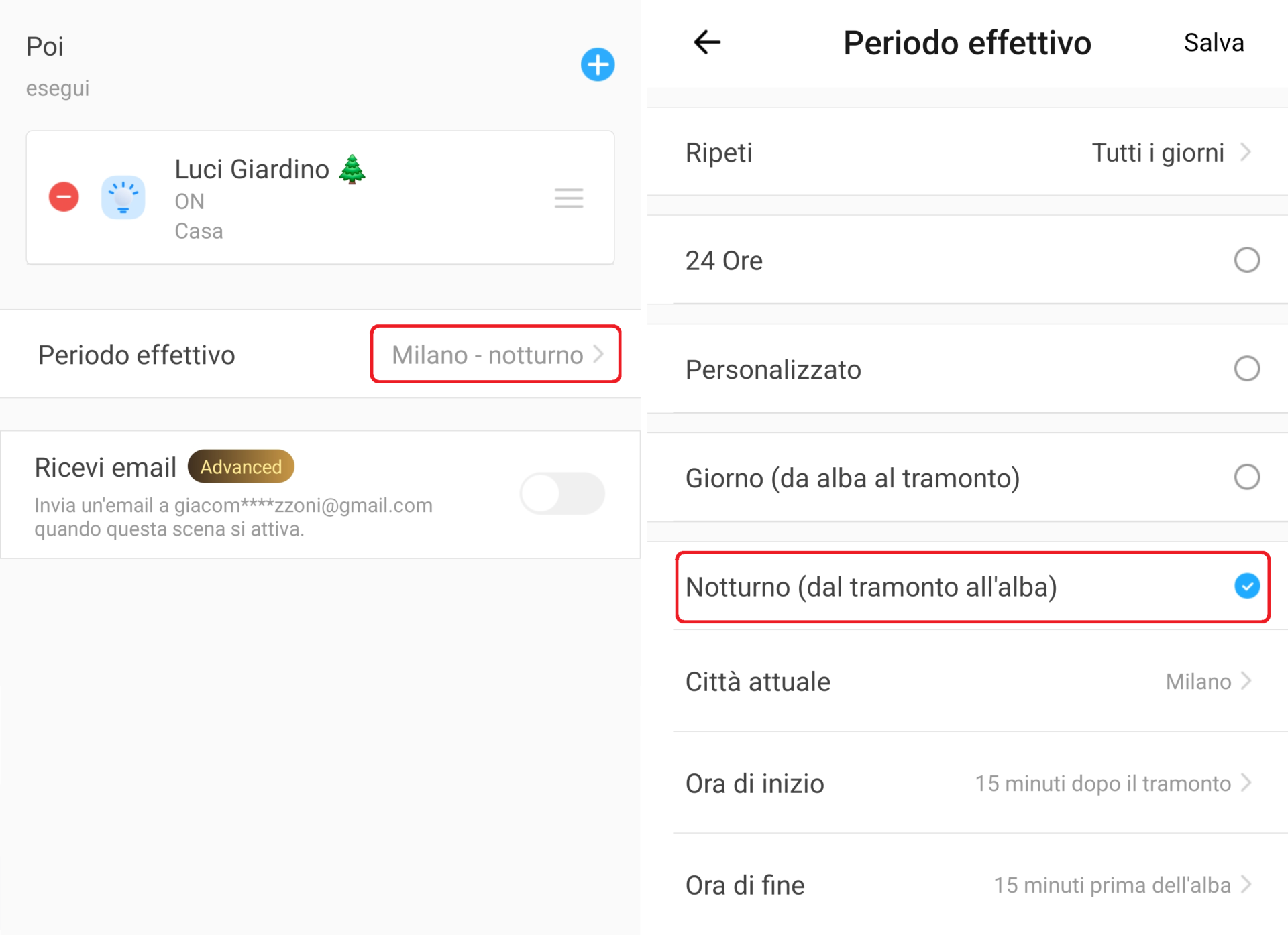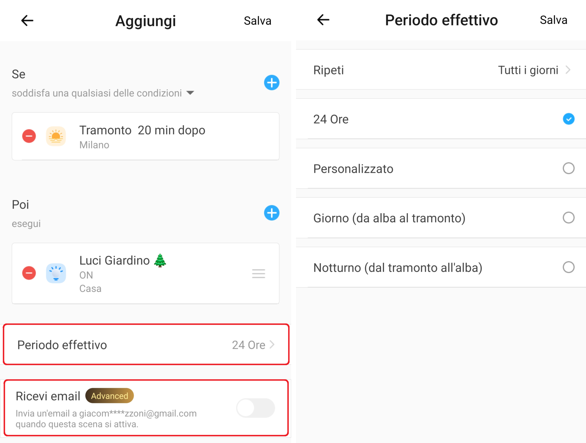 1. Se desiderate impostare un intervallo di attivazione dello scenario cliccate su Periodo effettivo e selezionate il valore desiderato (ripetizione giornaliera, 24 ore, personalizzato, giorno, notte, ecc.). Per ricevere un mail ogni volta che lo scenario viene eseguito attivate l’opzione Ricevi Mail (solo con abbonamento Advanced Plan);