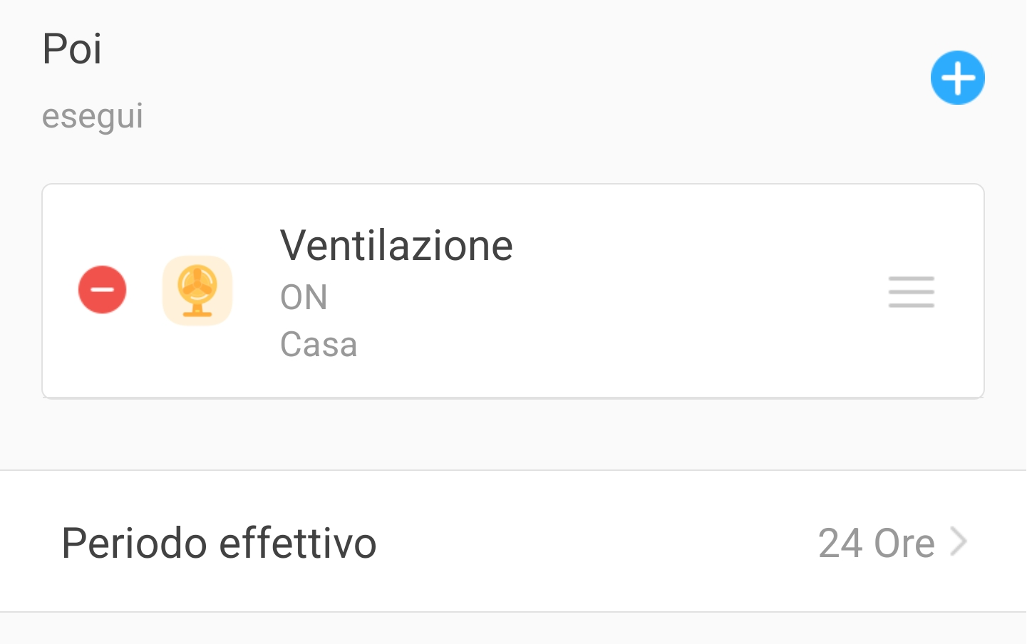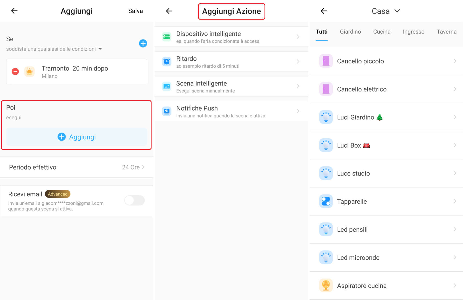 1. Ora cliccate su + Aggiungi in basso (comando POI ESEGUI) e selezionate le azioni che lo scenario eseguirà automaticamente al verificarsi delle condizioni sopra (SE QUESTO AVVIENE). Potete scegliere uno o più dispositivi domotici (switch, prese, ecc.), una scena intelligente già creata ed anche generare una notifica push che verrà visualizzata sullo smartphone quando lo scenario viene eseguito;