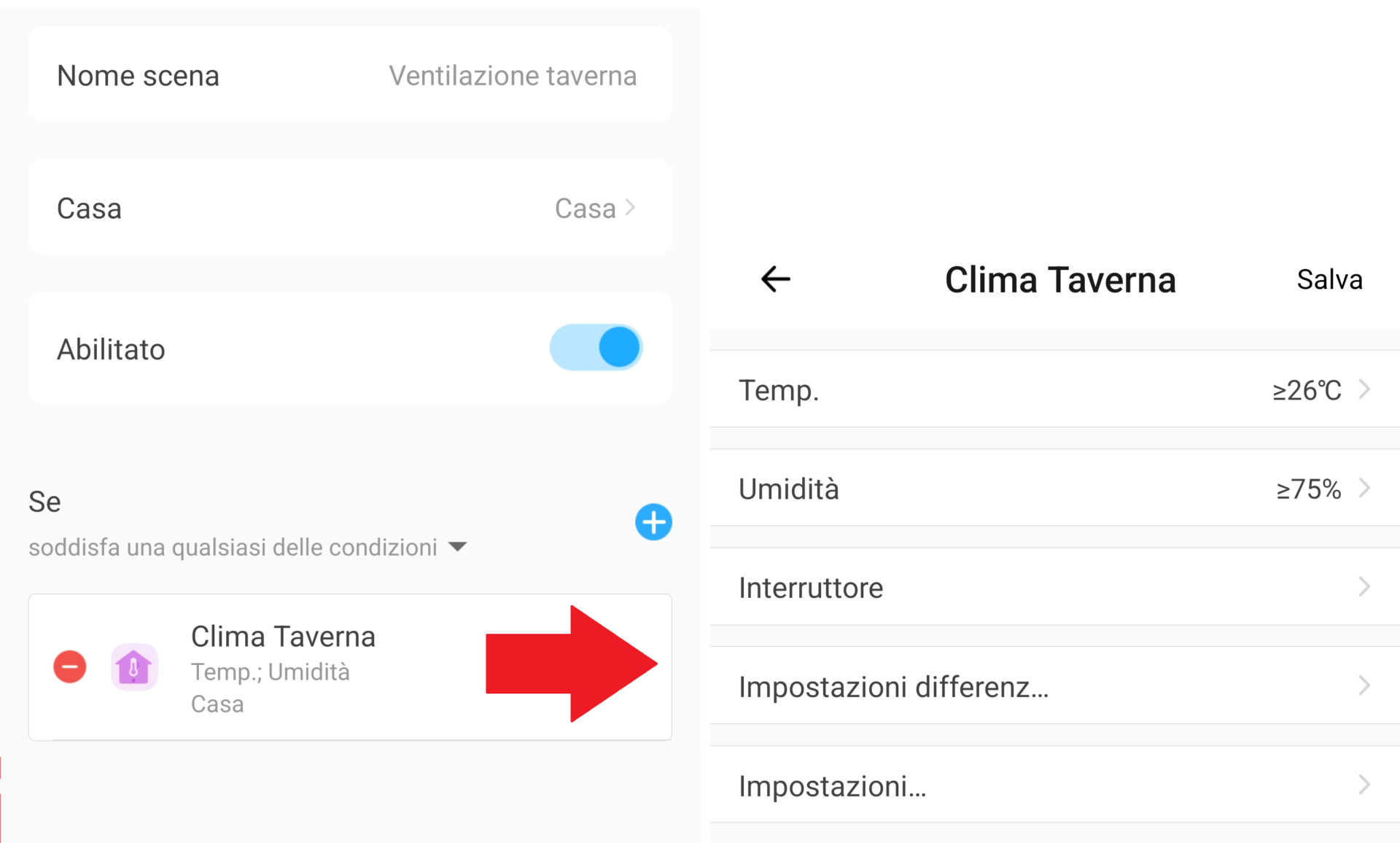 Questo scenario comanda automaticamente l’accensione della ventilazione di una stanza in base ai valori di temperatura e/o umidità rilevati da un sensore (stand-alone o integrato in uno smart switch). È possibile comandare anche aspiratori, deumidificatori, stufette elettriche, ecc. Per impostare anche lo spegnimento automatico basta copiare lo scenario per crearne uno identico e modificare le impostazioni (temp/umidità inferiori alla soglia, spegnimento ventilazione).