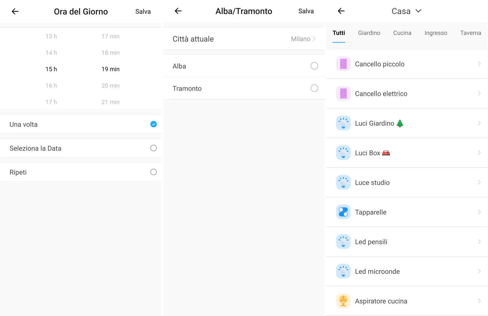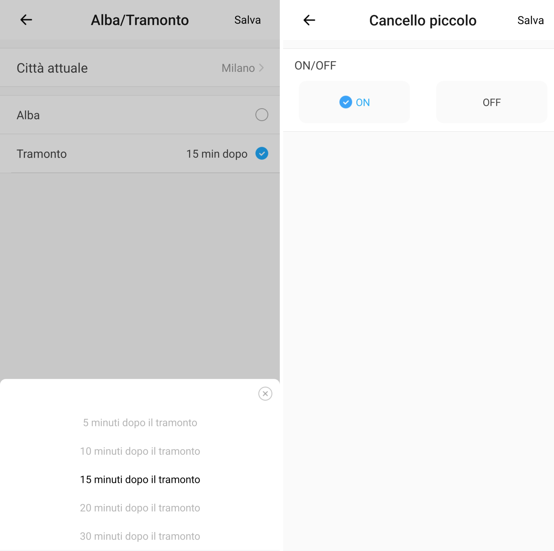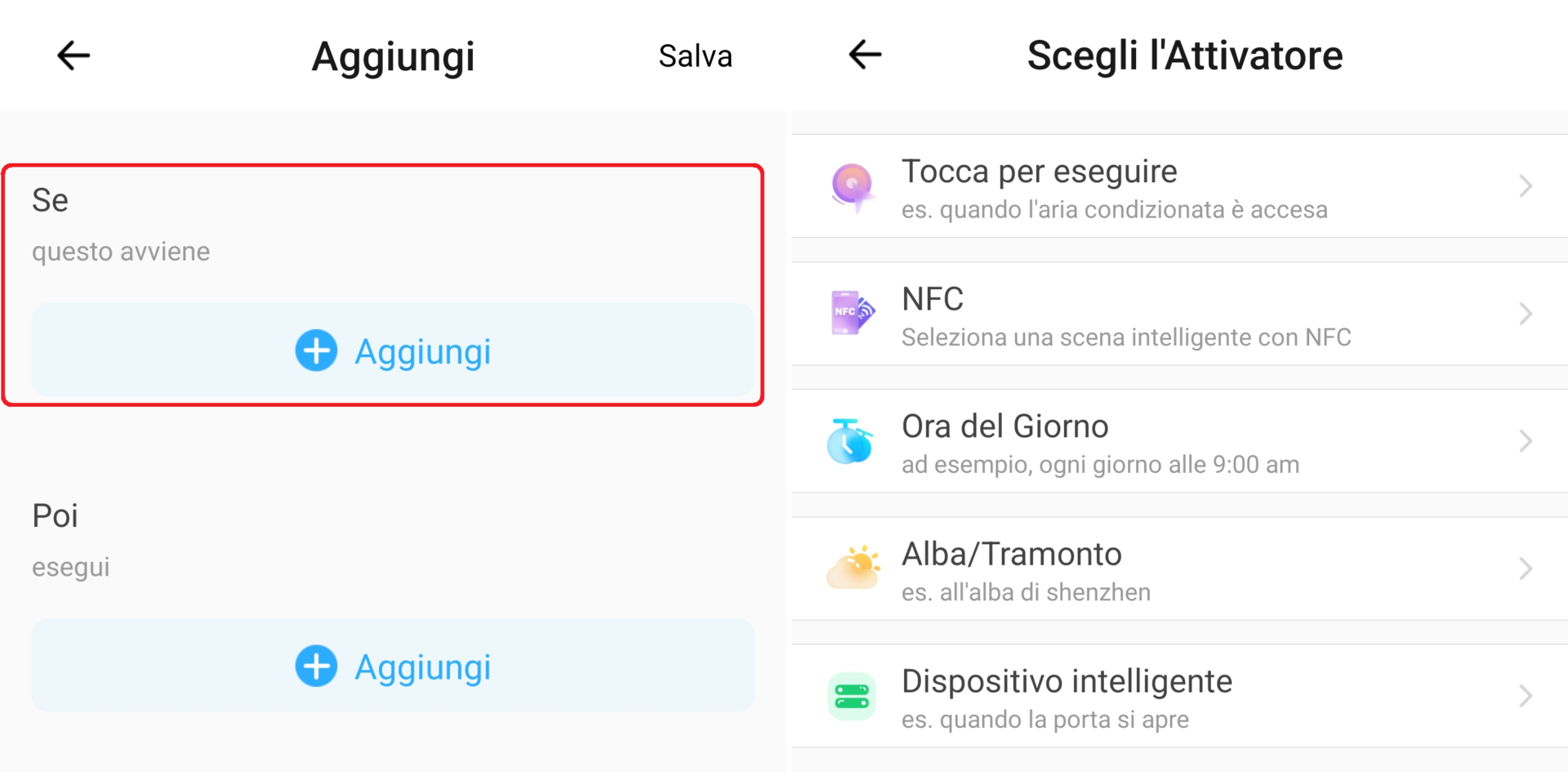 1. Configurate l’evento di attivazione (orario, data, frequenza, ripetizione, città per alba/tramonto, tag NFC, stato funzionamento smart switch/smart plug, temperatura, umidità, ecc.) e poi cliccate su Salva;