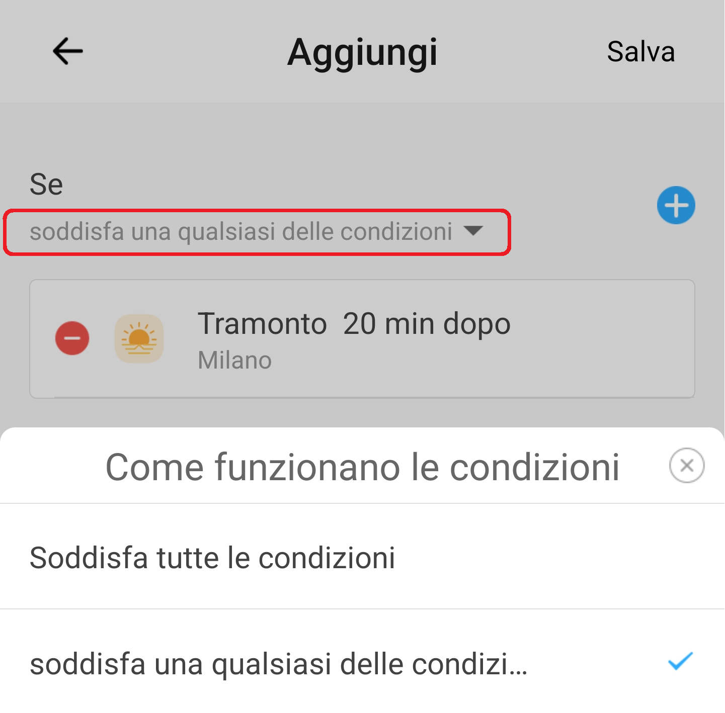 1. Se desiderate aggiungere altre condizioni di attivazione da utilizzare in alternativa (opzione “soddisfa una qualsiasi delle condizioni”) o in simultanea (“soddisfa tutte le condizioni”) cliccate nuovamente su + Aggiungi, selezionate e configurate le condizioni desiderate;