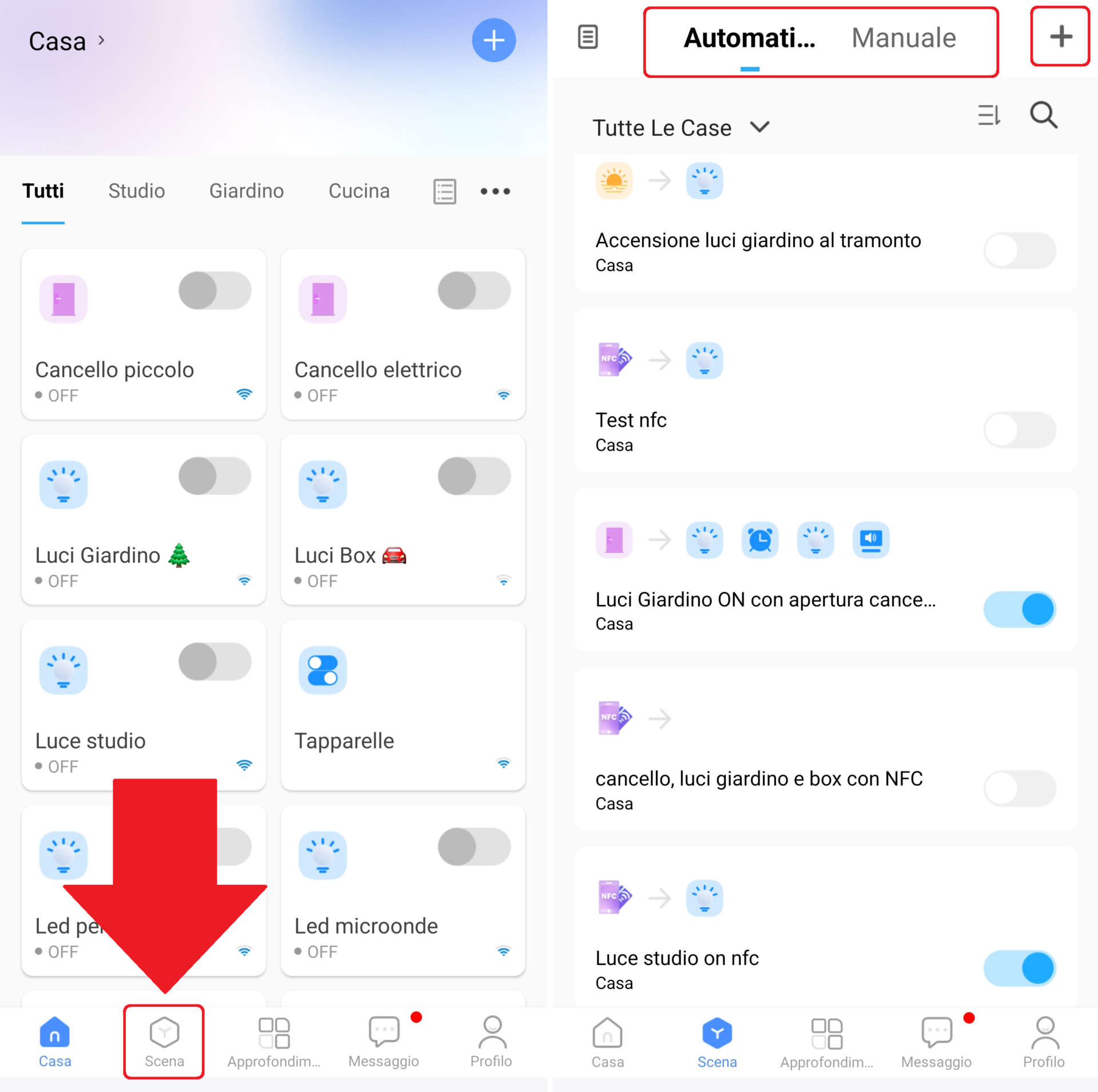 1. Dalla schermata Home della app cliccate in basso su Scena, poi in alto su Automatico o Manuale in base al tipo di scenario desiderato (vedi spiegazioni sopra) e infine su + in alto a destra;