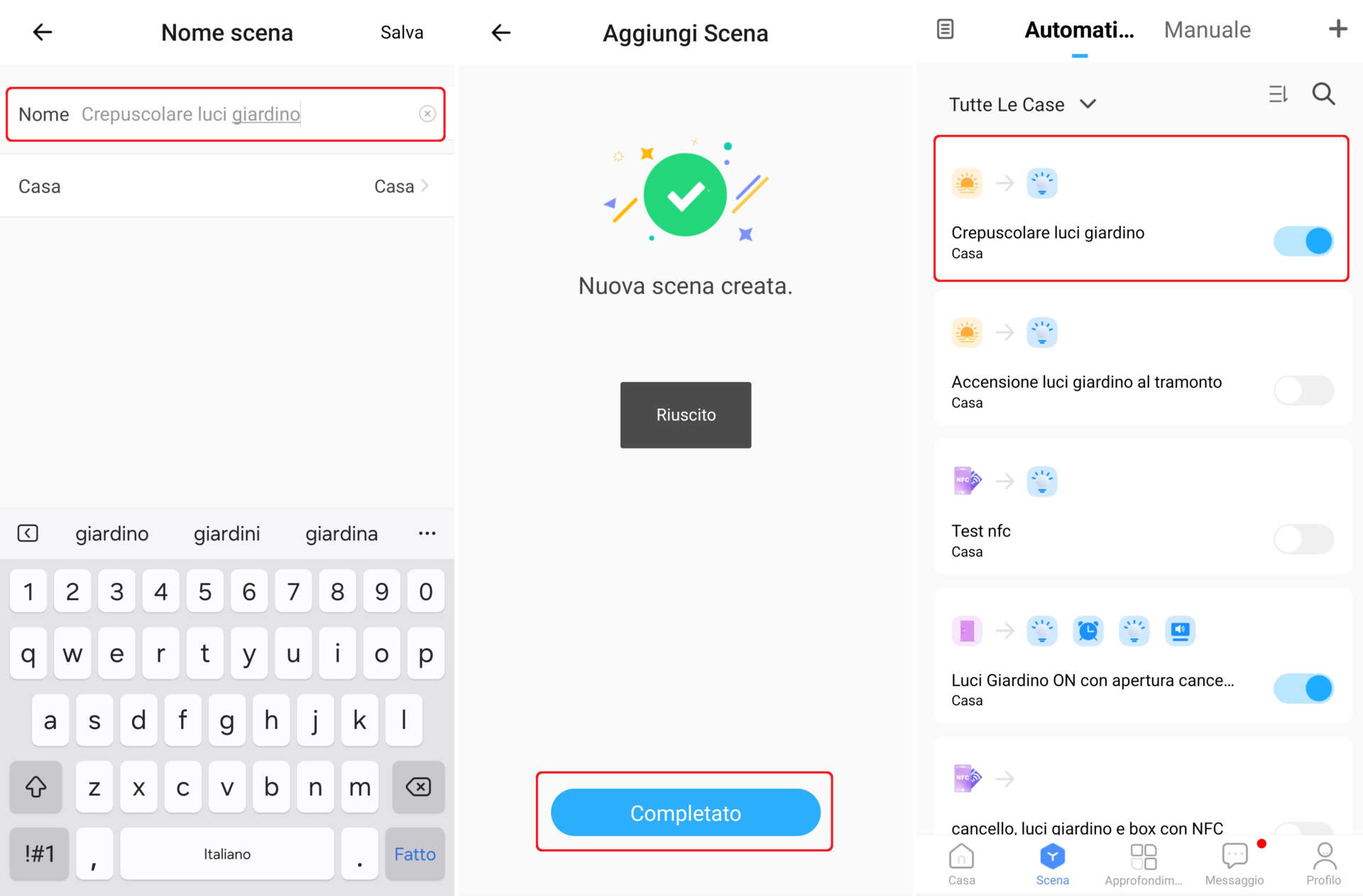 1. Cliccate su Salva in alto a destra, digitate un nome per lo scenario appena creato, selezionate la Casa, cliccate nuovamente su Salva e attendete la comparsa della finestra di conferma (Nuova scena creata). Cliccate su Completato per concludere l’operazione e verificate se lo scenario appena creato appare nell’elenco delle scene manuali o automatiche;