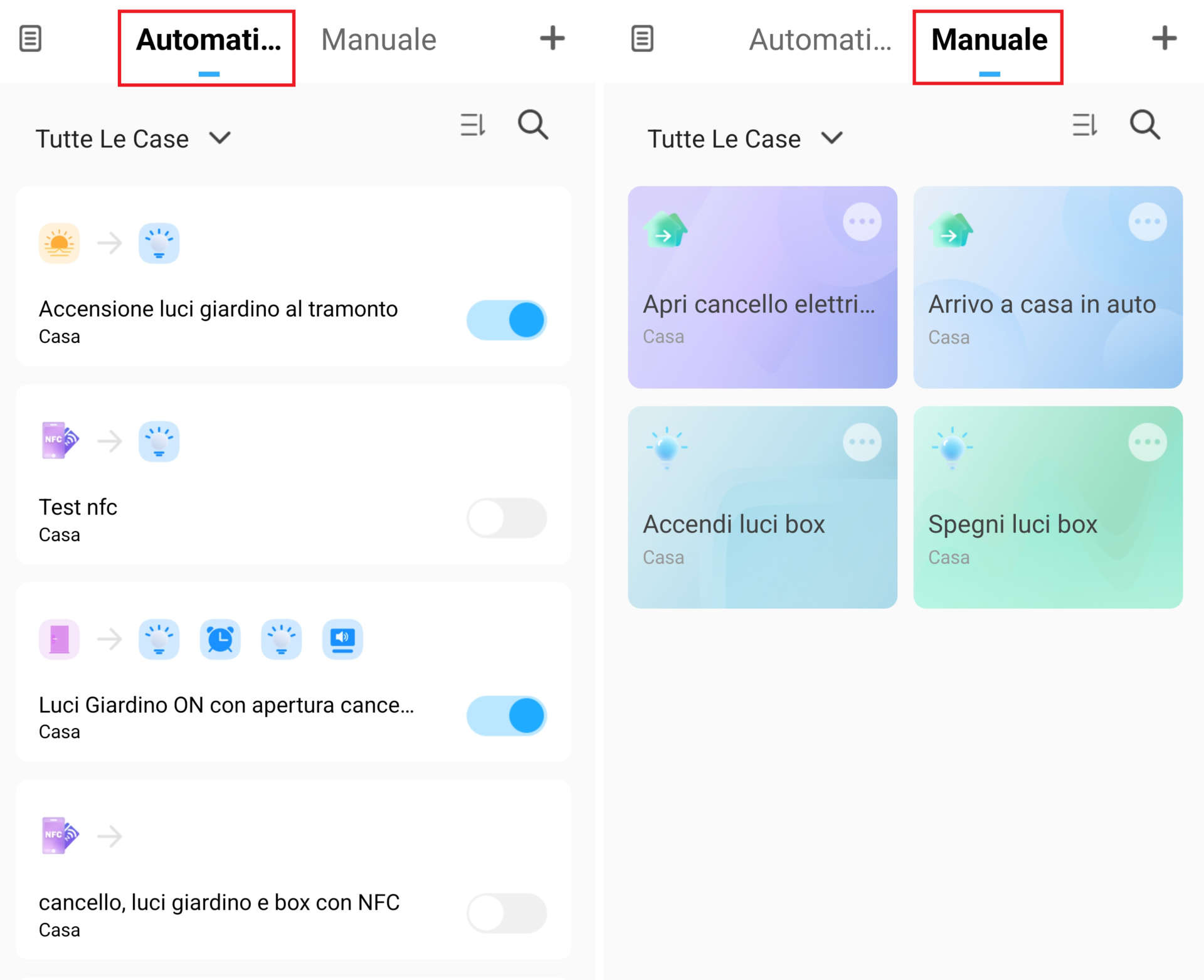 Questo scenario manuale apre il cancello elettrico e accende le luci cortile e garage quando si torna a casa in auto. Lo scenario si attiva con tag NFC (clicca qui per la guida) oppure toccando lo schermo dello smartphone o dell’autoradio (se compatibile Android Auto/CarPlay – vedi sopra).