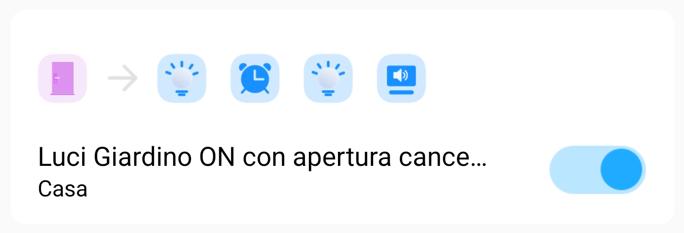 Questo scenario manuale apre il cancello elettrico e accende le luci cortile e garage quando si torna a casa in auto. Lo scenario si attiva con tag NFC (clicca qui per la guida) oppure toccando lo schermo dello smartphone o dell’autoradio (se compatibile Android Auto/CarPlay – vedi sopra).