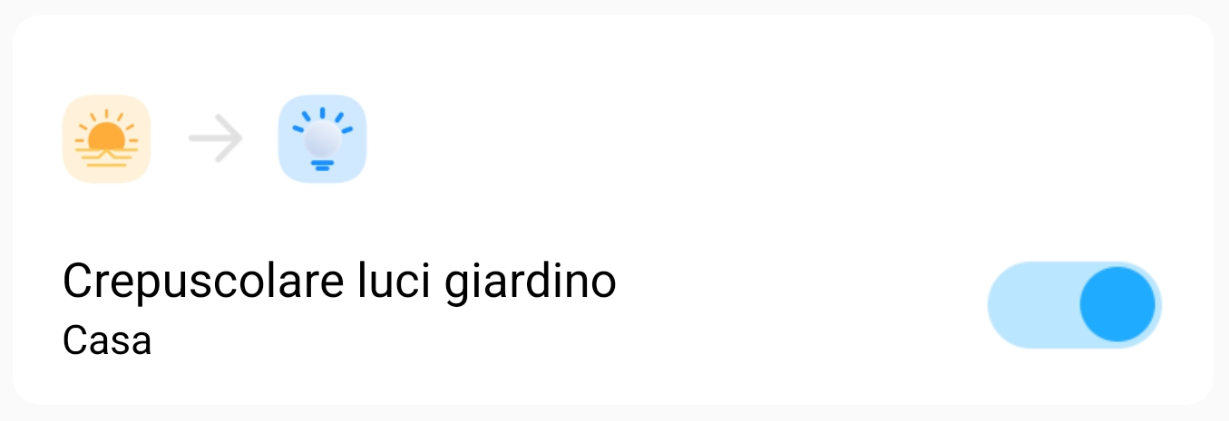 Questo scenario accende automaticamente le luci del cortile di casa quando si attiva l’apertura del cancello pedonale e solo di sera-notte (tramonto-alba), le mantiene accese per 2 minuti (timer) e poi le spegne. Tutti i dispositivi interessati devono essere già domotizzati con smart switch, plug, lampadine led smart, ecc.