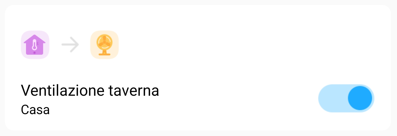 Questo scenario comanda automaticamente l’accensione della ventilazione di una stanza in base ai valori di temperatura e/o umidità rilevati da un sensore (stand-alone o integrato in uno smart switch). È possibile comandare anche aspiratori, deumidificatori, stufette elettriche, ecc. Per impostare anche lo spegnimento automatico basta copiare lo scenario per crearne uno identico e modificare le impostazioni (temp/umidità inferiori alla soglia, spegnimento ventilazione).