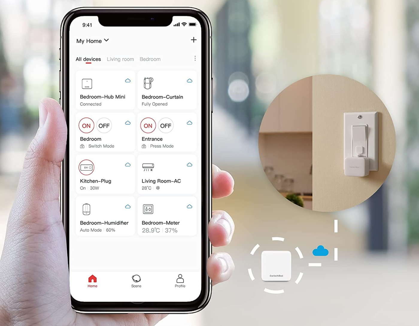 Per comandare il Finger-bot anche da lontano e da remoto, tramite scenari e routine oppure con i comandi vocali (es.: Alexa, Google e Siri), è necessario interfacciarlo ad un hub Bluetooth compatibile (come lo SwitchBot Hub Mini) che si collega anche alla rete Wi-Fi generata dal modem/router di casa e quindi al cloud.