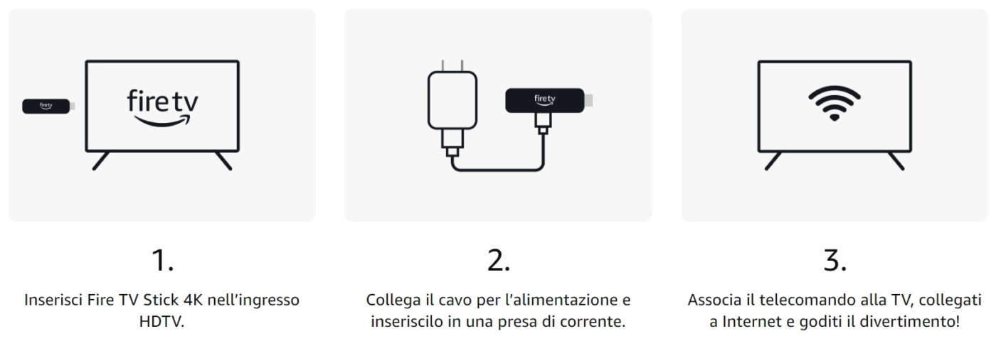 Una volta accesa si avvia la procedura di configurazione con la registrazione del telecomando, la scelta della lingua e della rete Wi-Fi, l’aggiornamento software (se necessario), il login Amazon e la scelta delle app. Se siete già clienti Prime e ordinate la chiavetta con il vostro account la procedura sarà ancora più semplice e veloce.