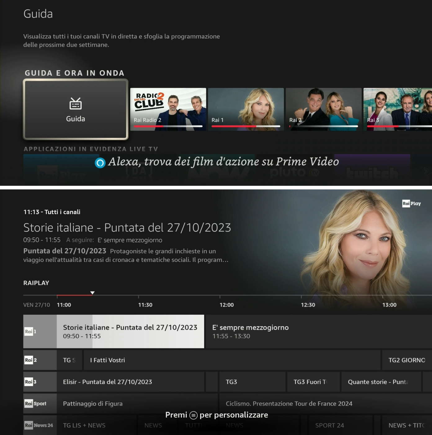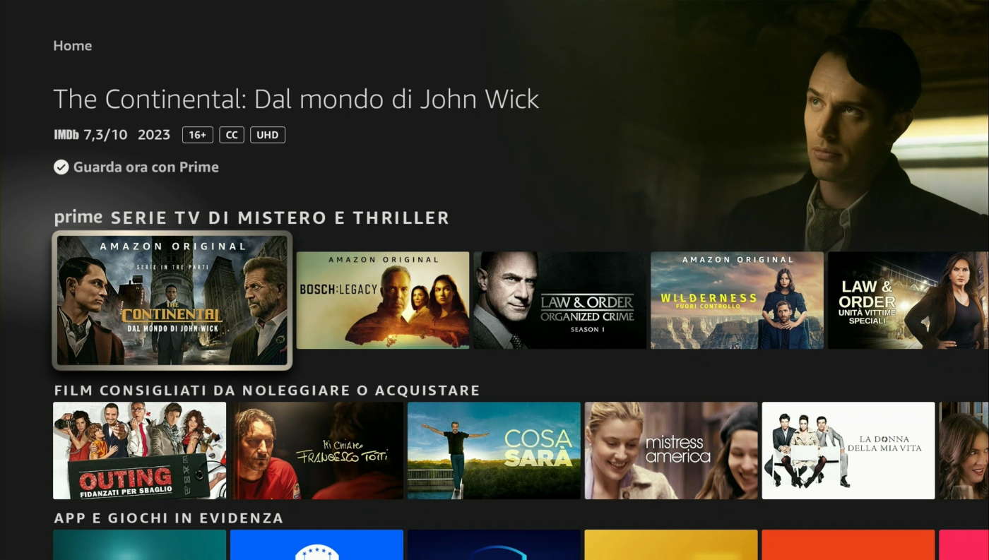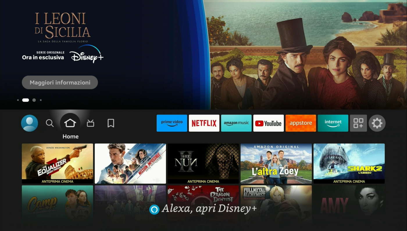 Al termine comparirà sullo schermo l’interfaccia grafica Fire TV con il menu principale al centro dello schermo per l’accesso rapido alle app preferite e ai contenuti in primo piano, la funzione Trova per scoprire film e serie Tv (titolo, attori, genere, categorie, ecc.) e i Profili personalizzati per ogni membro della famiglia (cronologia, suggerimenti, programmi da guardare, ecc.).