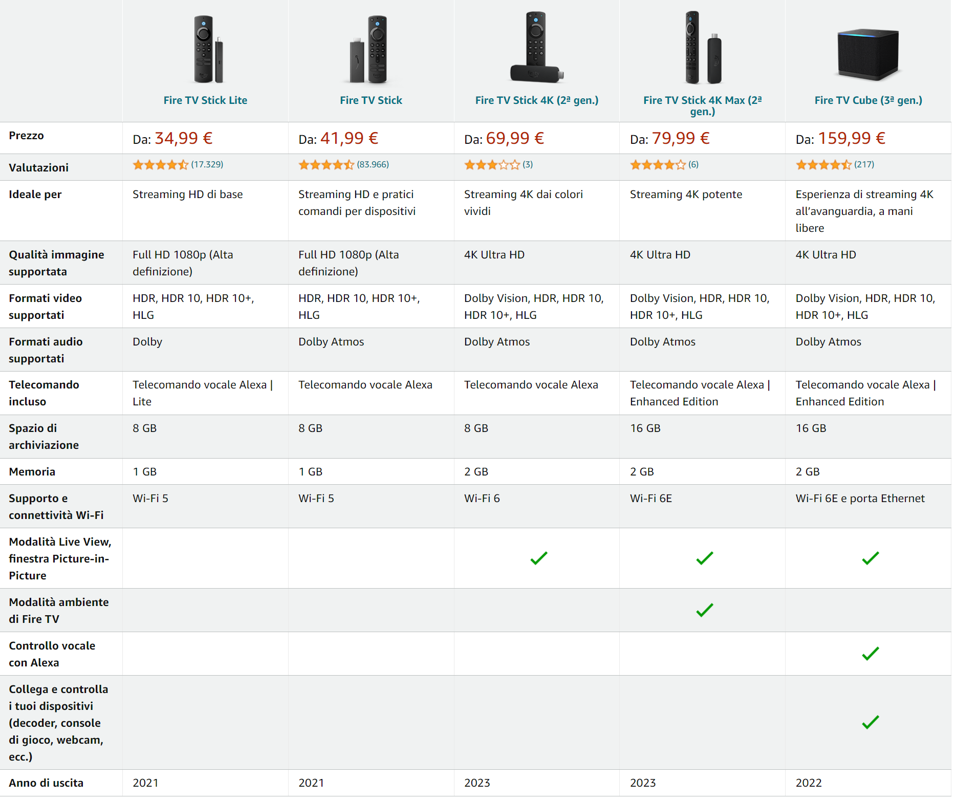 La gamma Fire TV comprende attualmente quattro chiavette e un box (Cube) con differenti caratteristiche tecniche e dotazioni (Full HD o 4K, potenza CPU, memoria, ecc.) per soddisfare qualsiasi esigenza e budget.