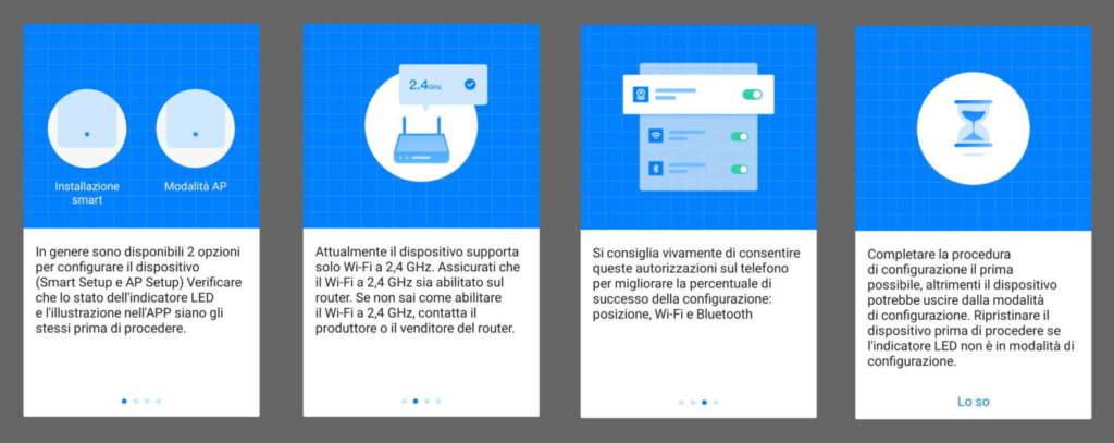 La connessione Wi-Fi richiede una rete a 2,4 GHz (no 5 GHz) mentre la dotazione comprende il cavo di alimentazione USB (5V 1A) ma non l’adattatore AC 220V. Il produttore dichiara una portata massima di 8 metri a 360° e la copertura di locali fino a 16 mq.