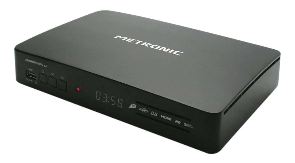 Andromeda 3.1 è il top di gamma tivùsat della francese Metronic, un box interattivo HD aggiornato alle ultime tecnologie e con diversi plus interessanti. Supporta già le trasmissioni HEVC (oltre naturalmente le attuali MPEG-2 e MPEG-4) e gli impianti satellitari dCSS (anche DiSEqC e SCR). Permette di accedere ai servizi tivùon! connessi (RaiPlay e altri) ma solo su piattaforma MHP 1.1.3 e non HbbTV. Non mancano nemmeno le funzioni PVR come la registrazione dei programmi radiotelevisivi ed il Timeshift (automatico e manuale), comodi e pratici anche se con alcune limitazioni di sicurezza già viste in altri modelli come il supporto USB dedicato e la visione attraverso lo stesso decoder che ha effettuato la registrazione (no export, editing e archiviazione).