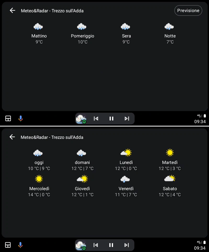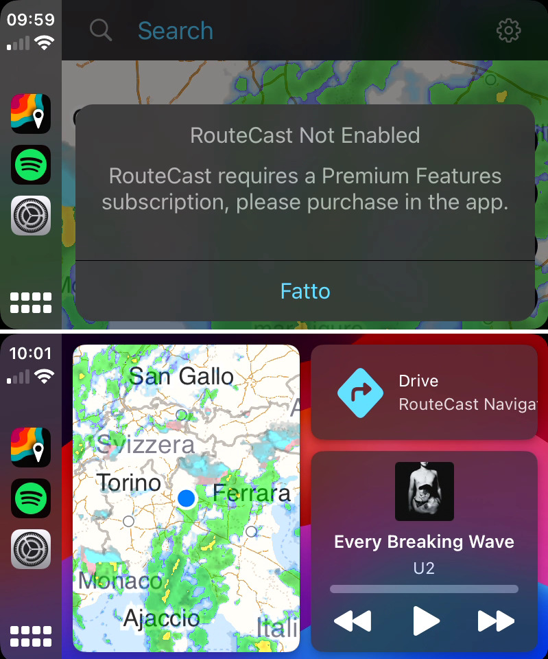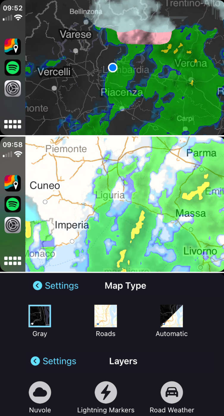 Con l’aggiornamento di inizio febbraio la app supporta anche lo Split Screen, ovvero la visualizzazione delle mappe radar insieme alle schermate di altre applicazioni come navigatori, player musicali, ecc. Ciò significa che potete avere sul display del vostro infotainment sia il percorso di Google Maps o Waze sia le condizioni meteo lungo la strada.