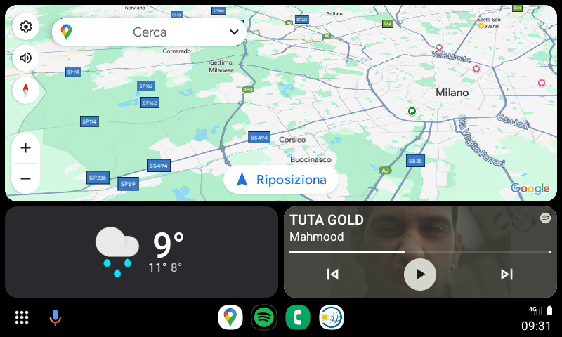 Se il vostro infotainment supporta la grafica multi-screen potete vedere sempre le condizioni meteo (es.: nuvoloso con temperatura attuale, minima e massima) grazie alla finestra dedicata (in basso, a sinistra o destra a seconda del formato o dimensioni del display). Se la cliccate potete ascoltare da Google Assistant lo stesso riepilogo visto sopra.