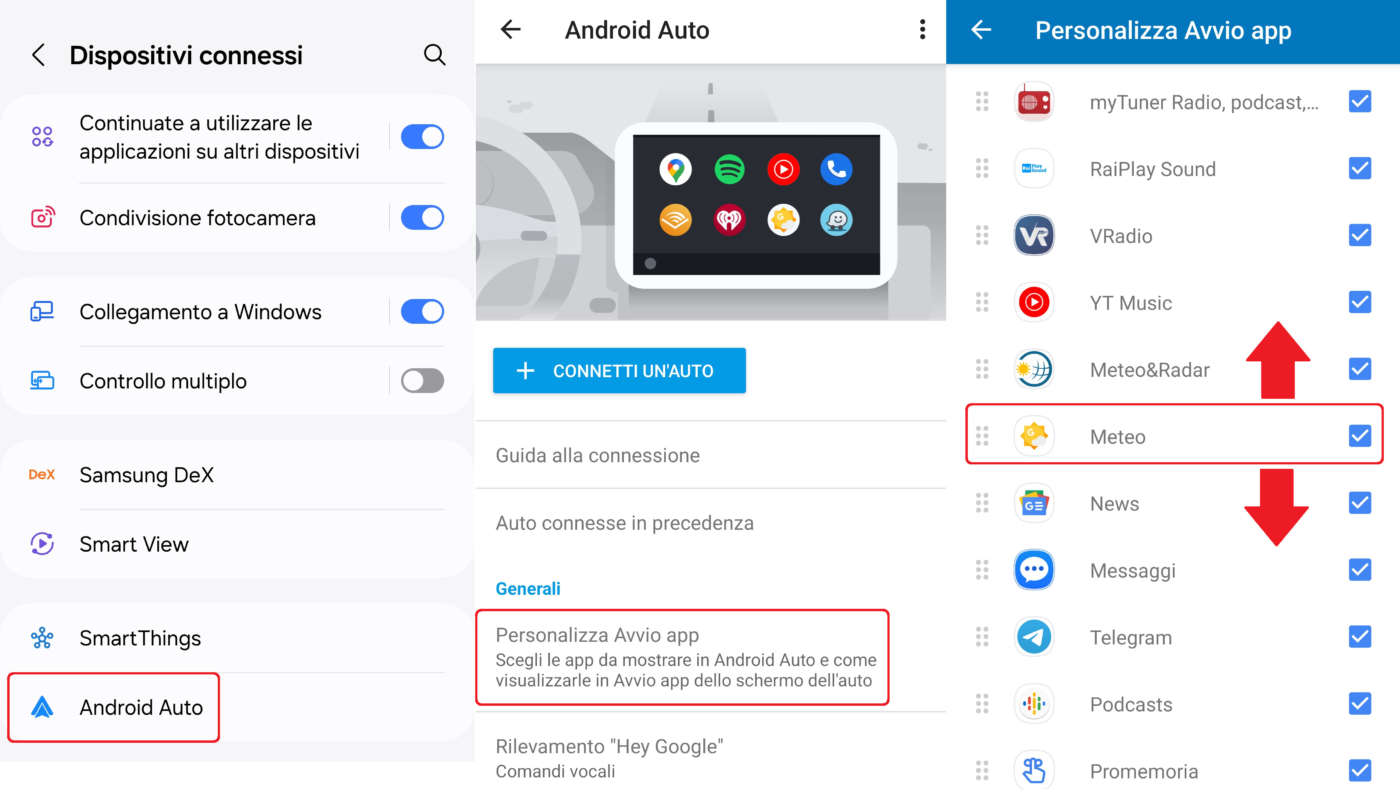 Cliccate sui puntini a sinistra per spostare la app Meteo verso l’alto (oppure in basso) dove preferite e, al termine, cliccate la freccia (back) in alto a sinistra e riavviate Android Auto.