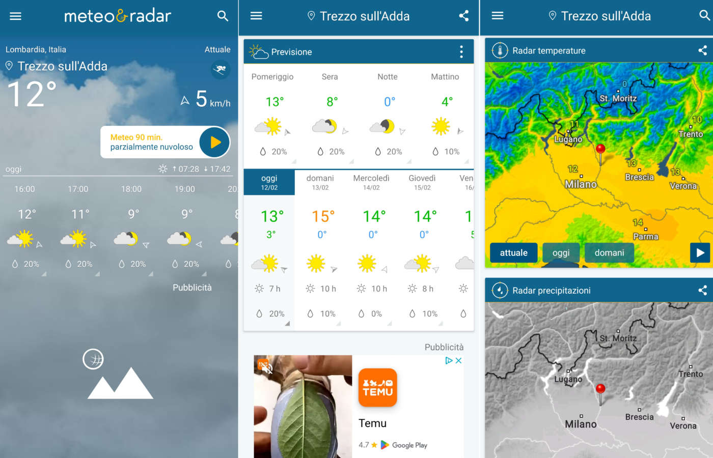 Il suo punto di forza sono le mappe radar dinamiche e interattive con pinch-to-zoom in/out ed animazioni delle ultime 2 ore relative a copertura nuvolosa, precipitazioni, venti, temperature e qualità dell’aria.