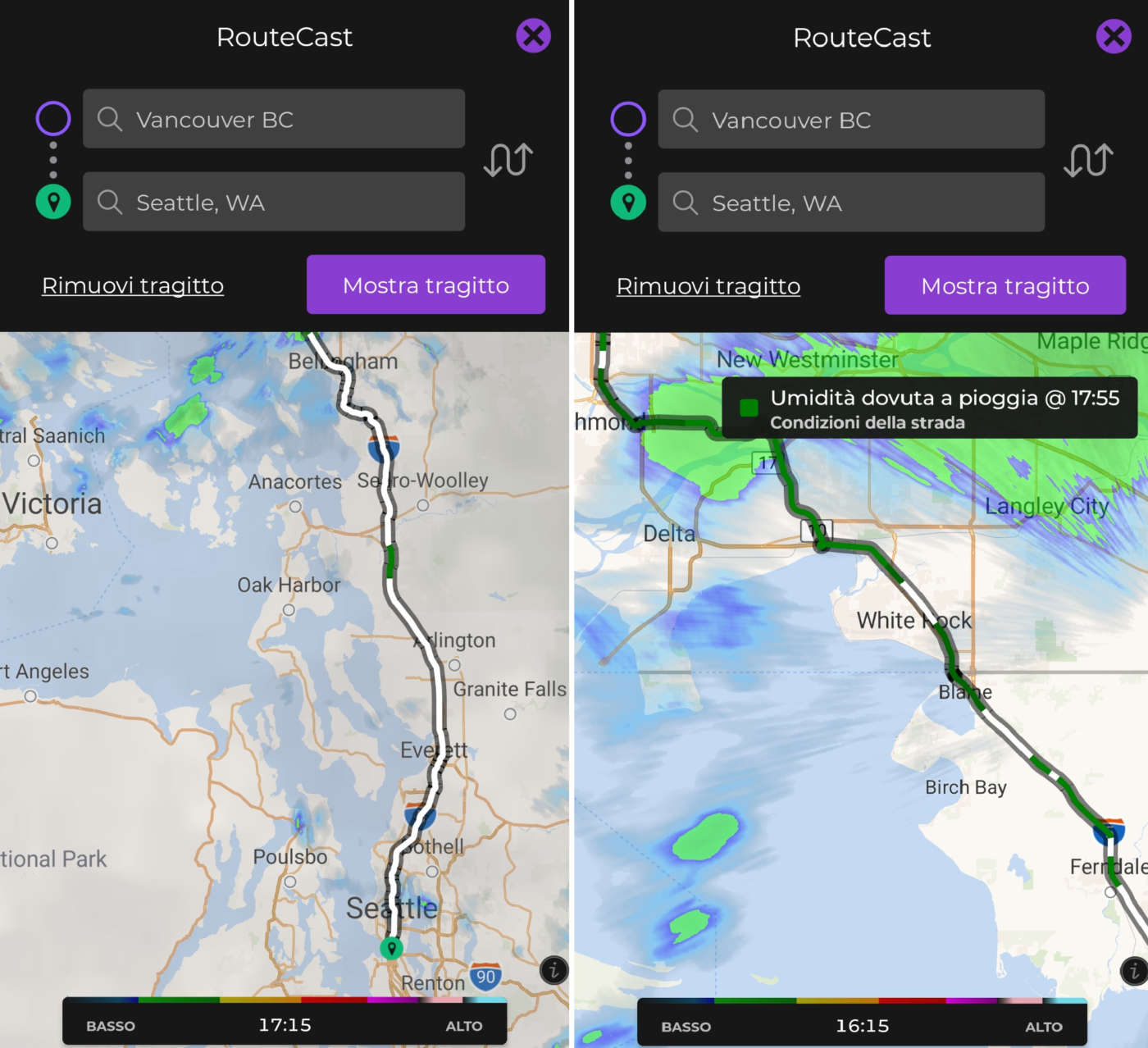 È possibile cercare la località interessata per ottenere le informazioni meteo sul percorso (RouteCast) e visualizzare la mappa radar in split screen con musica e istruzioni guida RouteCast con navigatore integrato.