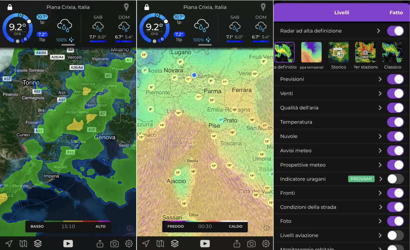La barra menu in basso permette di ricercare una località, centrare la mappa sulla posizione GPS, scegliere una delle carte a disposizione (scura, strade, aerea, topografica, ecc.), i livelli su mappa (previsioni, venti, qualità dell’aria, temperatura, nuvole, avvisi e prospettive meteo, fronti, ecc.), condividere foto e animazioni via mail e social.