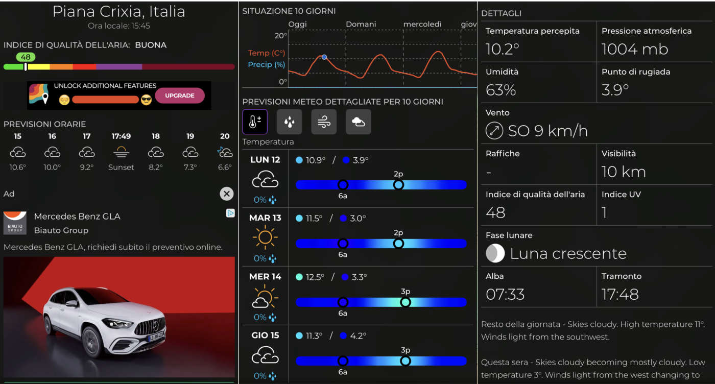 Fornisce anche i dati essenziali e completi (stato cielo, temperatura attuale, massima e minima, umidità, qualità dell’aria, situazione a 10 giorni, ecc.) della località desiderata (GPS o punto della mappa), le previsioni a 48 ore, gli avvisi meteo, le previsioni e le condizioni del percorso lungo un tragitto (funzione RouteCast al momento disponibile solo negli USA).