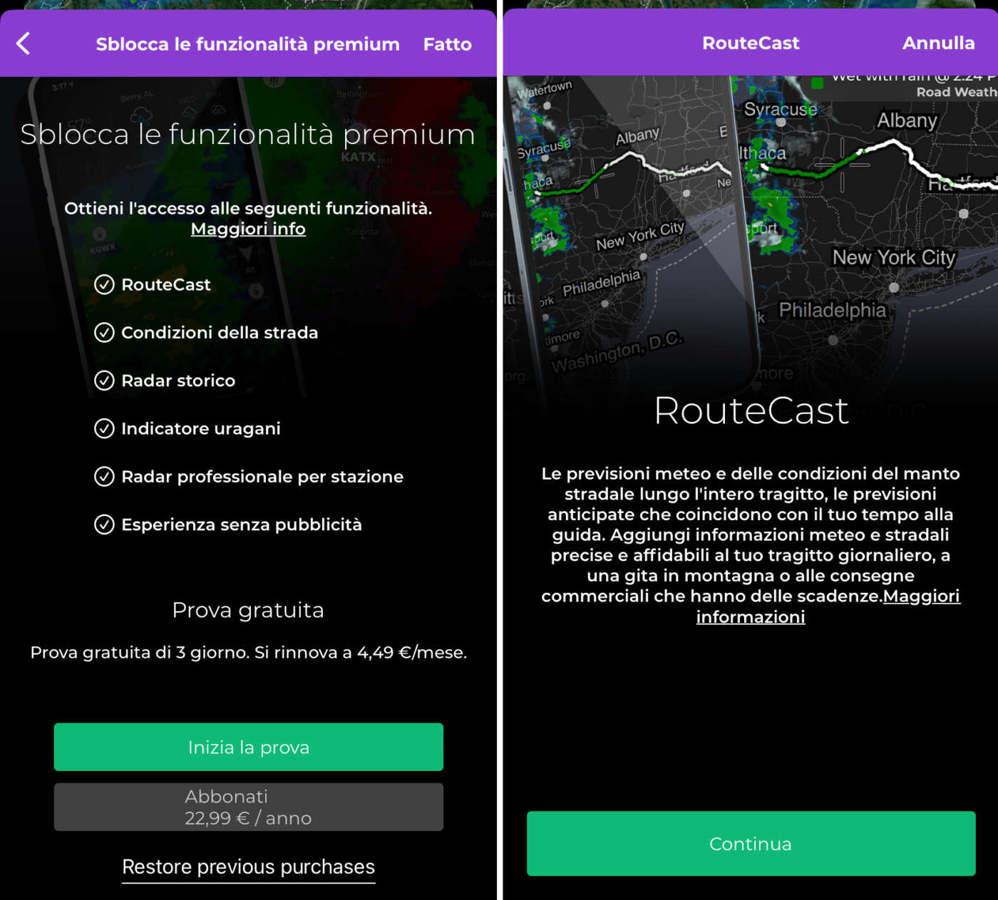 Per eliminare la pubblicità (poco invasiva) e sbloccare le funzioni Premium (RouteCast, storico radar, indicatore uragani e altro) basta attivare l’abbonamento mensile al costo di 4,49 euro (con 3 giorni di prova gratuita) oppure quello annuale da 22,99 euro.