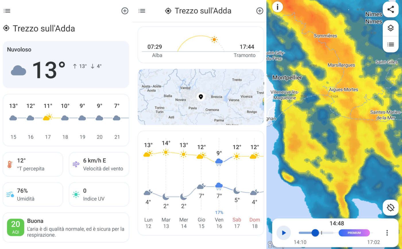 Un numero crescente di app fornisce non solo le informazioni base sulla situazione meteo attuale e futura (stato del cielo, temperatura min/max, umidità, venti, ecc.) ma anche le mappe radar con le immagini statiche o dinamiche relative a copertura nuvolosa, precipitazioni (con vari colori associati all’intensità – pioggia lieve, moderata, forte, nubifragio) e venti, in tempo reale e in continuo aggiornamento.