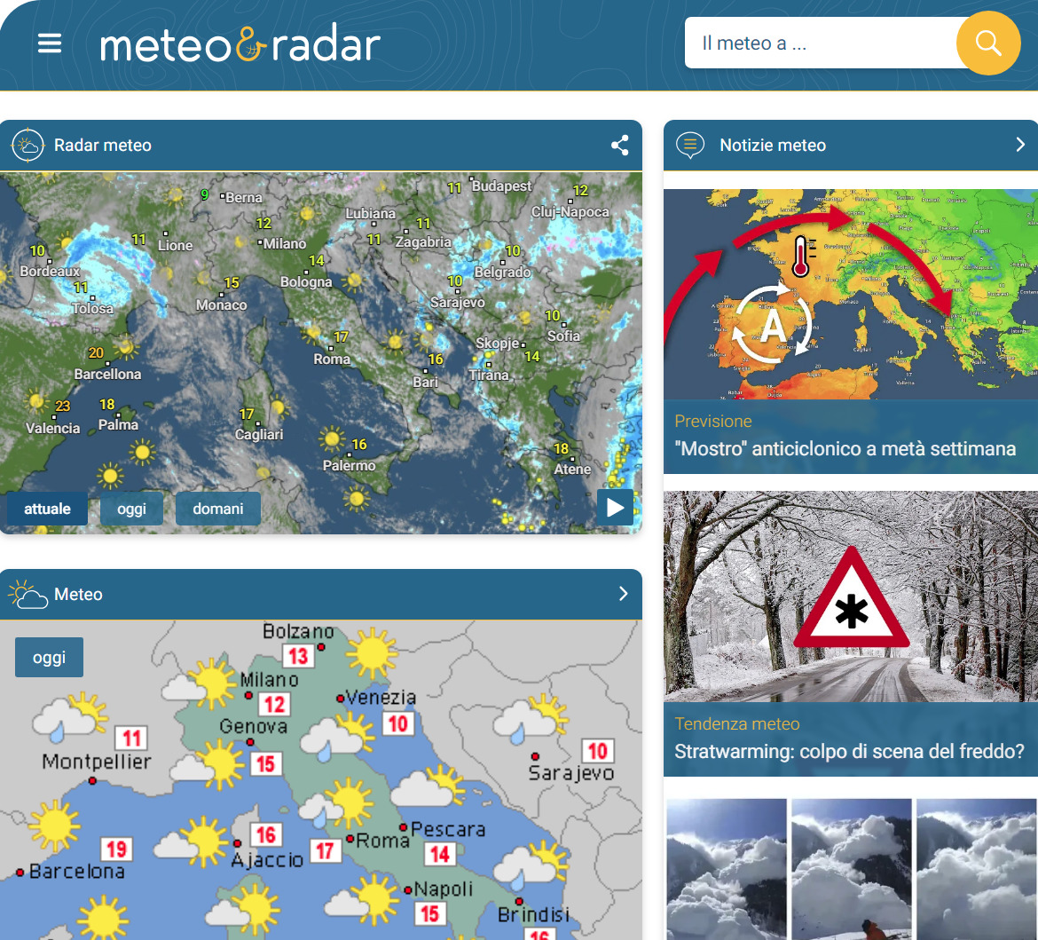 Tra i contenuti principali segnaliamo le previsioni meteo orarie, giornaliere e settimanali (fino a 14 giorni) con tanti dati utili (temperature reali e percepite, probabilità e intensità delle precipitazioni, vento, soleggiamento, alba, tramonto, fasi lunari, pressione, umidità, indice UV, qualità dell’aria, ecc.), le allerte meteo con notifiche push, il radar interattivo con pioggia, grandine, neve, venti, fulmini e temperature per le località italiane e mondiali, il bollettino neve e mare, le webcam, i widget e molto altro.