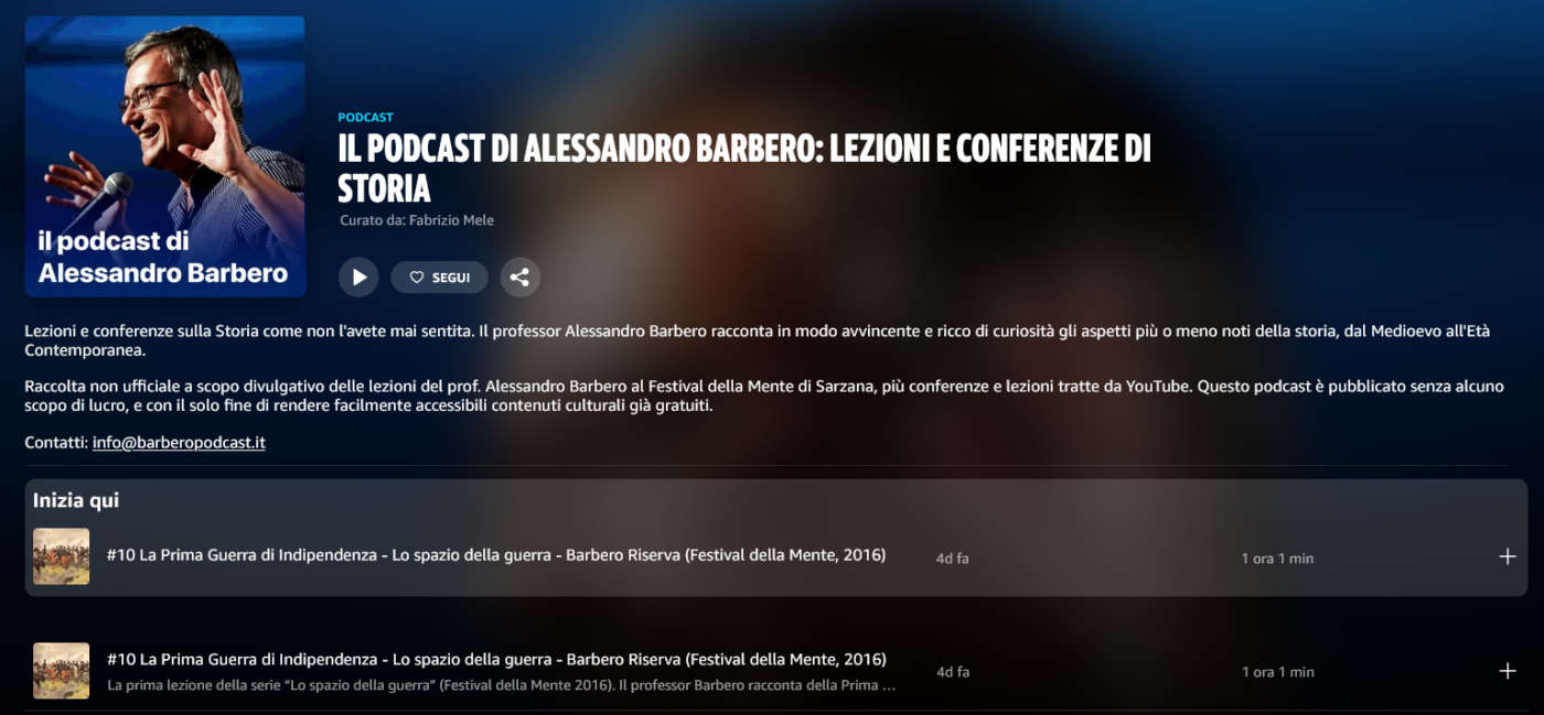 Tra i podcas presenti troviamo titoli come Bunga Bunga, Il podcast di Alessandro Barbero (che non è curato dallo storico, ma da un appassionato che pubblica le sue conferenze) e Start – Le notizie del Sole 24 Ore.