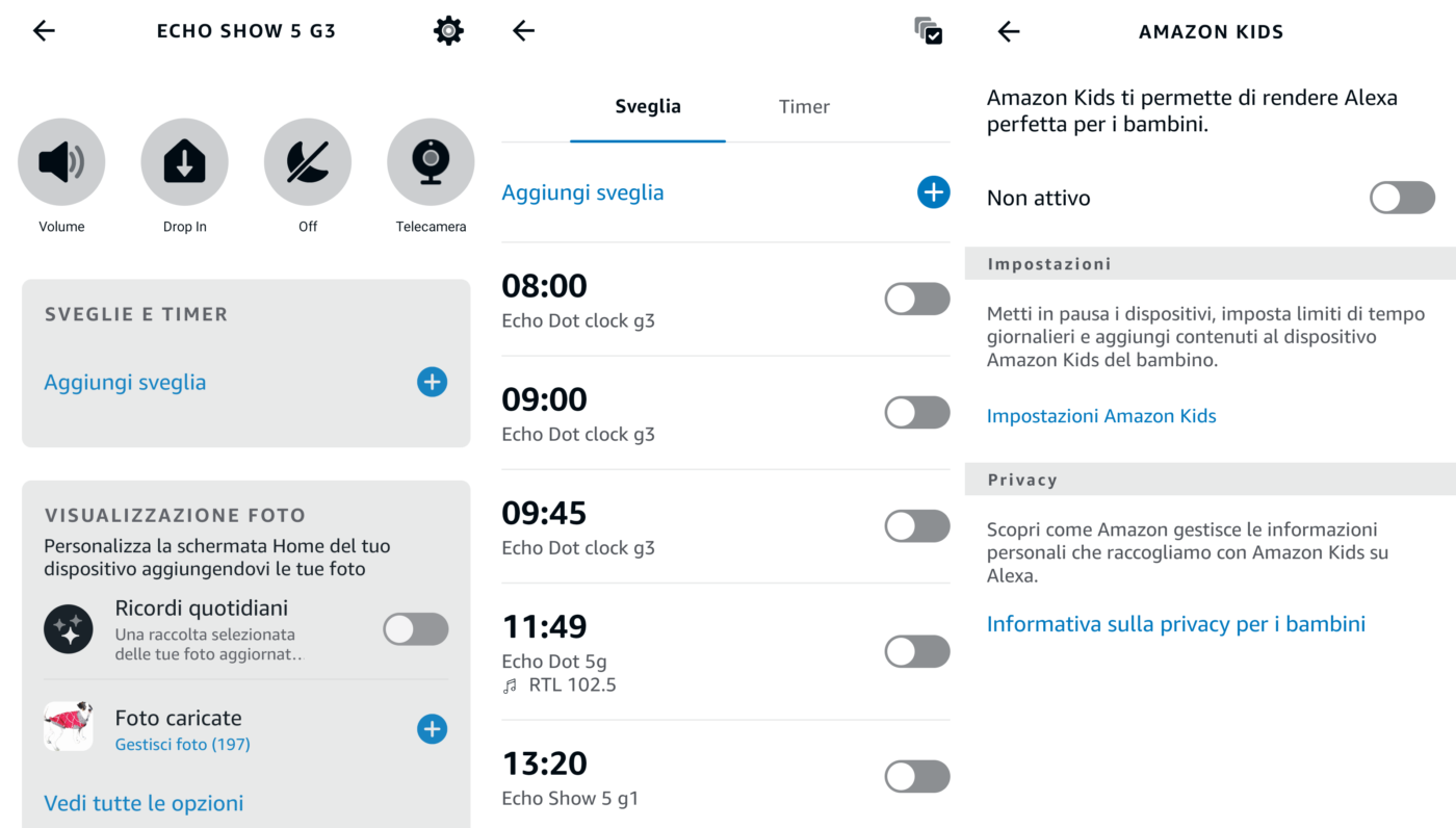 Al termine si può installare sullo smartphone la app Alexa (iOS/Android) così da visualizzare il nuovo Echo Show 5 tra i dispositivi Echo/Alexa disponibili e controllabili da smartphone (setup, audio, sveglia, timer, live view, Bluetooth, privacy, Alexa Kids, skill, ecc.).