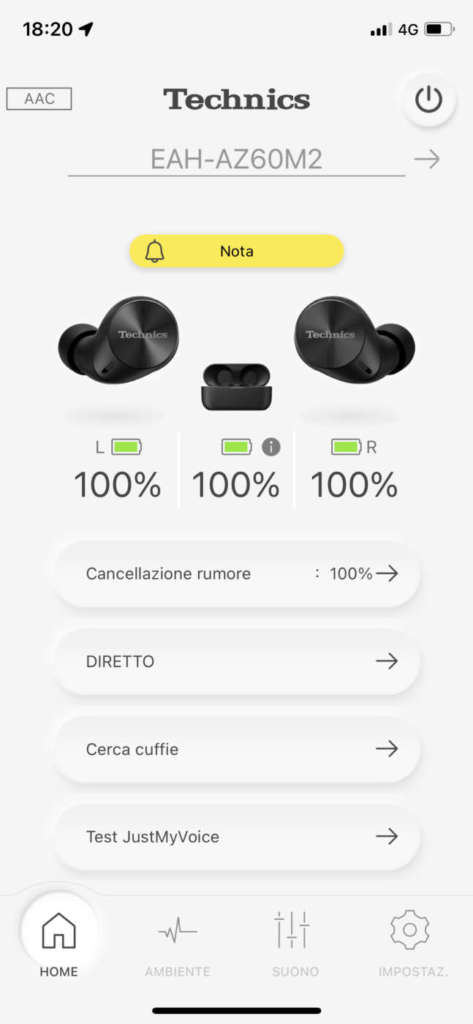 Una volta completata la prima configurazione, l’ottima app di gestione realizzata da Technics rimane quasi sempre inutilizzata: tutte le funzioni e le principali opzioni di configurazione possono infatti essere controllate direttamente dagli auricolari. Durante il test non abbiamo sentito l’esigenza di modificare la curva di risposta delle cuffie, ma l’app offre anche un equalizzatore a cinque bande e alcuni preset pronti all’uso. Molti comandi offrono un feedback vocale riprodotto direttamente dagli auricolari, e la lingua può essere personalizzata dall’utente (è disponibile anche l’italiano).