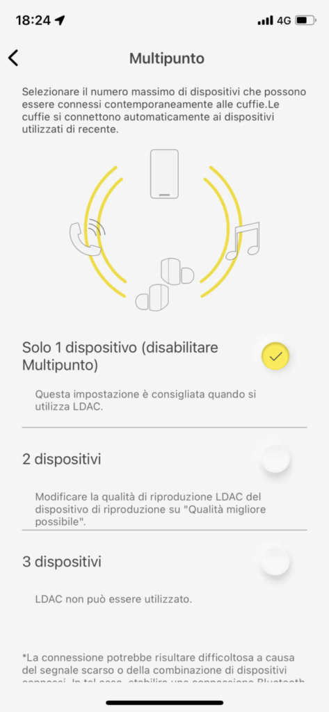 Una delle caratteristiche più innovative implementate da Technics è la connettività multipunto, che consente di passare rapidamente tra tre sorgenti distinte senza dover impostare manualmente la connessione ogni volta; l’implementazione è molto efficace ed è preziosissima per chi si trova spesso a utilizzare gli auricolari con più dispositivi in contemporanea (per esempio smartphone e PC). Questa funzione garantisce la connessione con un massimo di tre device, che scendono a due nel caso si utilizzi il codec Bluetooth Ldac; in ogni caso, si tratta di una funzione davvero comoda e (purtroppo) ancora poco diffusa.