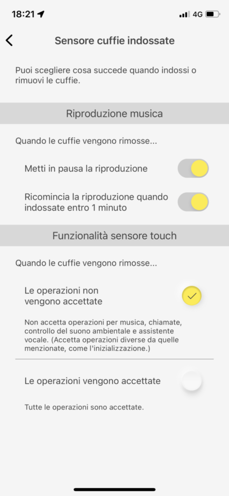 Gli auricolari sono controllabili tramite comandi touch agendo sulle superfici esterne. La risposta è totalmente personalizzabile sfruttando l’app di controllo: la distribuzione predefinita dei comandi è abbastanza efficace, ma si potrebbe voler aggiungere il controllo diretto di alcuni parametri importanti, come per esempio il volume. Le cuffie riconoscono anche quando vengono indossate o rimosse, e possono rispondere automaticamente: interrompono la riproduzione e la riprendono in modo automatico se indossate di nuovo entro un minuto (queste opzioni possono essere attivate o disattivate a piacere). Inoltre, si spengono automaticamente se rimangono inutilizzate per un periodo di tempo personalizzabile a piacere.