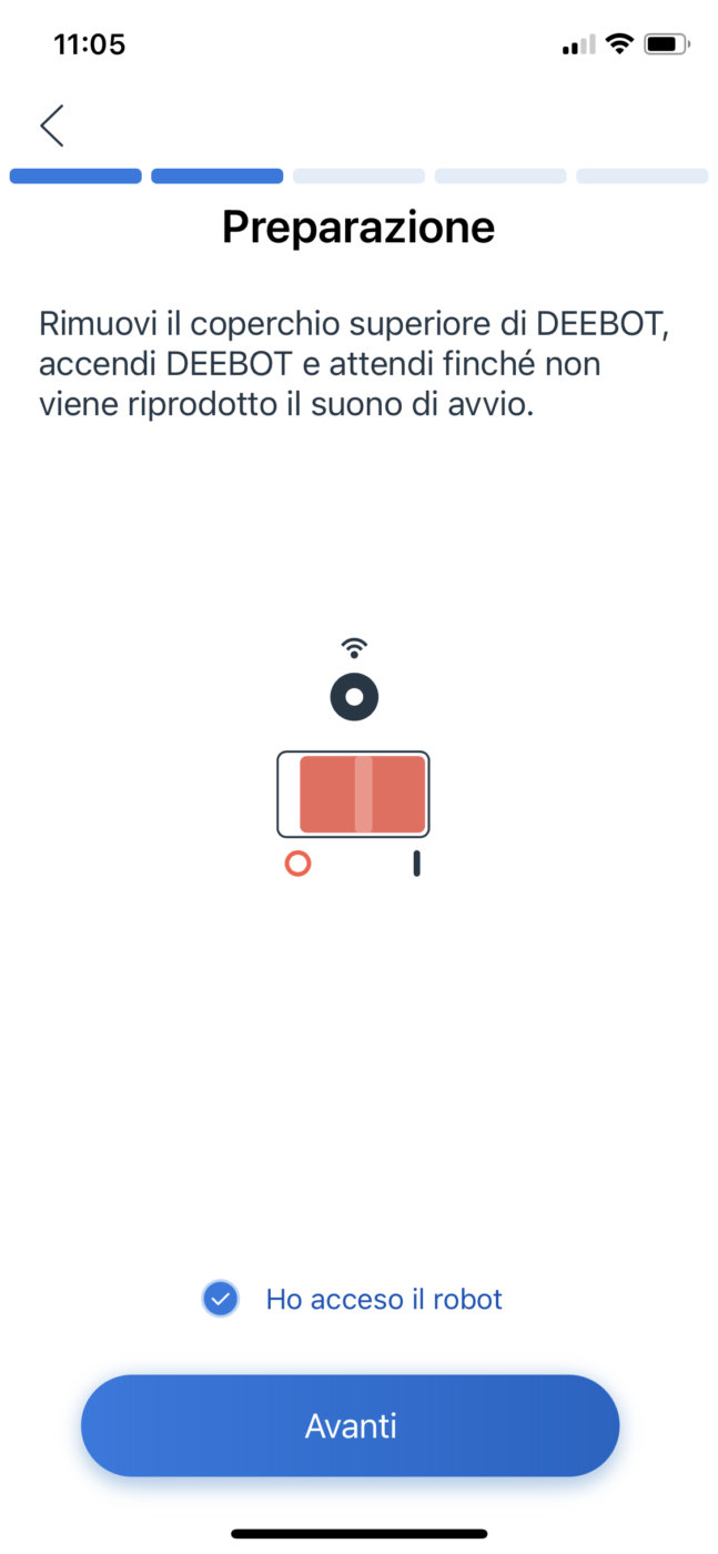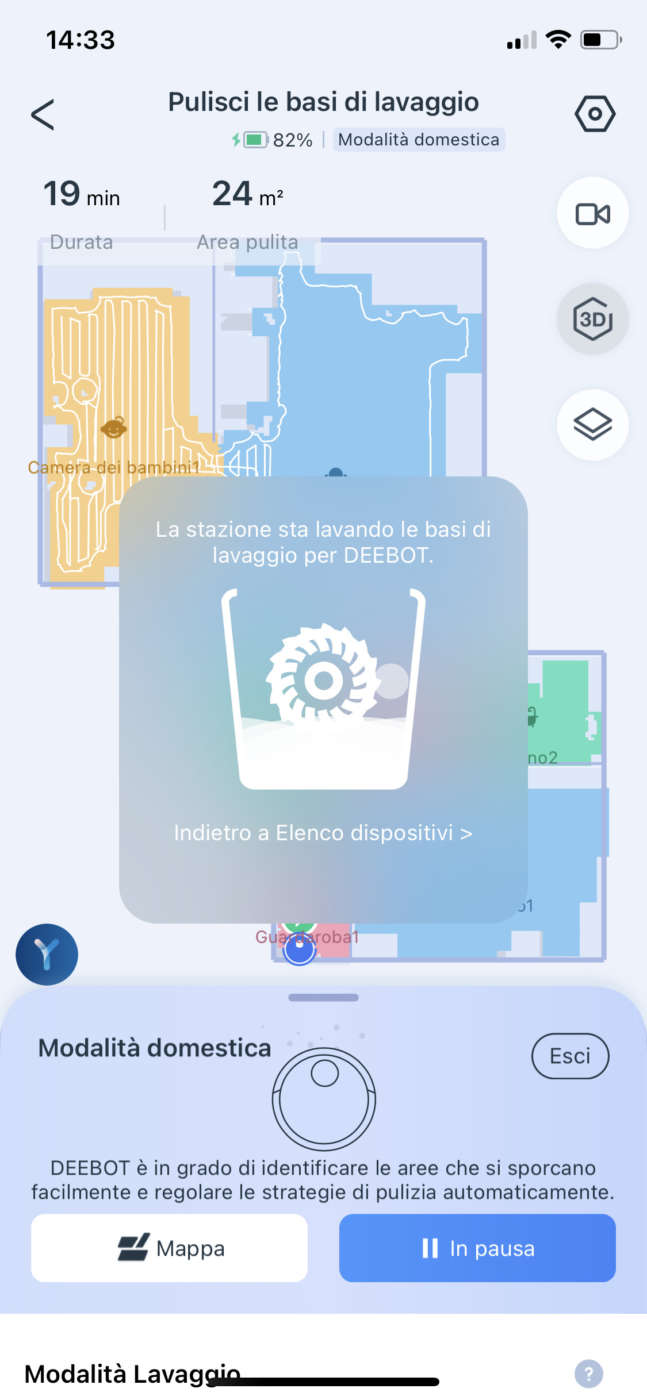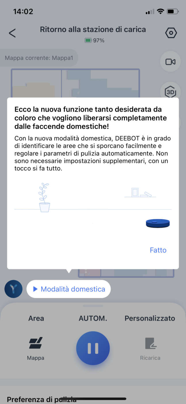 Come accade nella quasi totalità dei casi, le operazioni di configurazione, monitoraggio e gestione del robot sono affidate a un’app per smartphone, disponibile naturalmente sia per iOS sia per Android. La prima configurazione richiede la creazione di un account Ecovacs, dopodiché basta seguire le istruzioni a schermo per individuare il robot e aggiungerlo ai dispositivi controllati, integrandolo anche nella rete locale tramite Wi-Fi. Il robot comunica con notifiche inviate ai dispositivi collegati tramite l’App di Ecovacs e anche con messaggi vocali: è disponibile un pacchetto vocale in italiano che semplifica l’uso per chi fatica con l’inglese. Una volta completata la configurazione iniziale si può inviare il robot in perlustrazione per mappare l’ambiente, avendo cura di aprire tutte le porte ed eliminare eventuali ostacoli che rendano impossibile l’accesso ad alcune aree dell’abitazione.