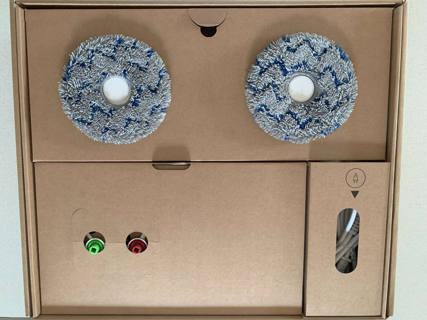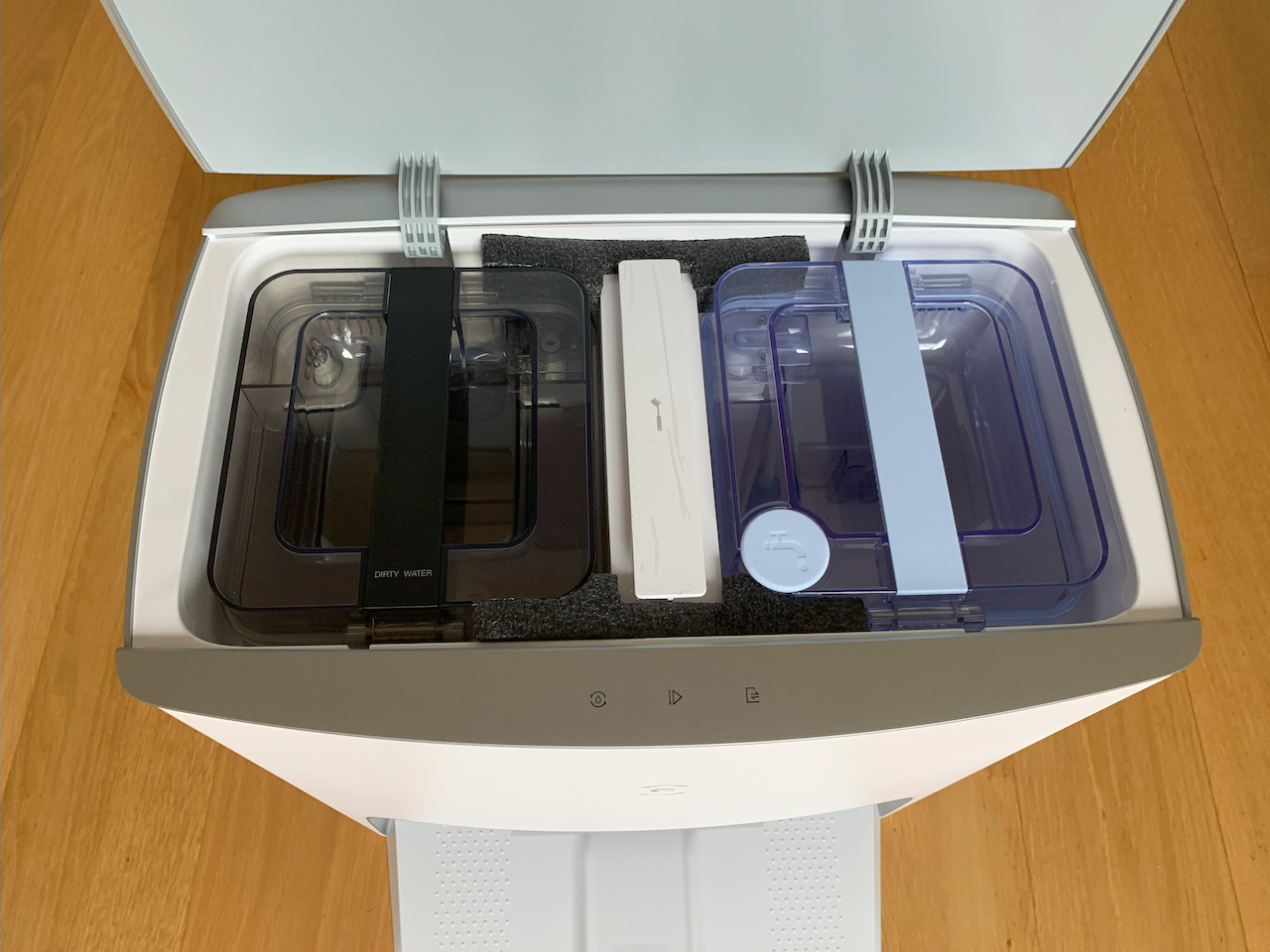 Il robot è distribuito in una confezione di cartone grande e pesante, con un imballaggio molto robusto che protegge tutti i componenti: l’elemento più voluminoso non è il robot ma la base di ricarica, che ospita due serbatoi da oltre 3 litri ciascuno, per l’acqua pulita e quella sporca. La base non raccoglie quindi la polvere, che rimane invece nel contenitore integrato nel corpo del robot, con tutti i limiti di capienza di questa soluzione.