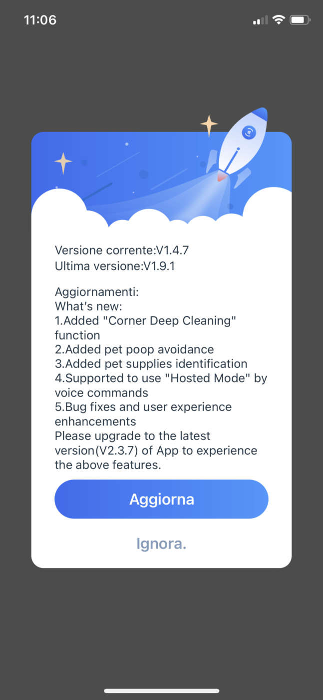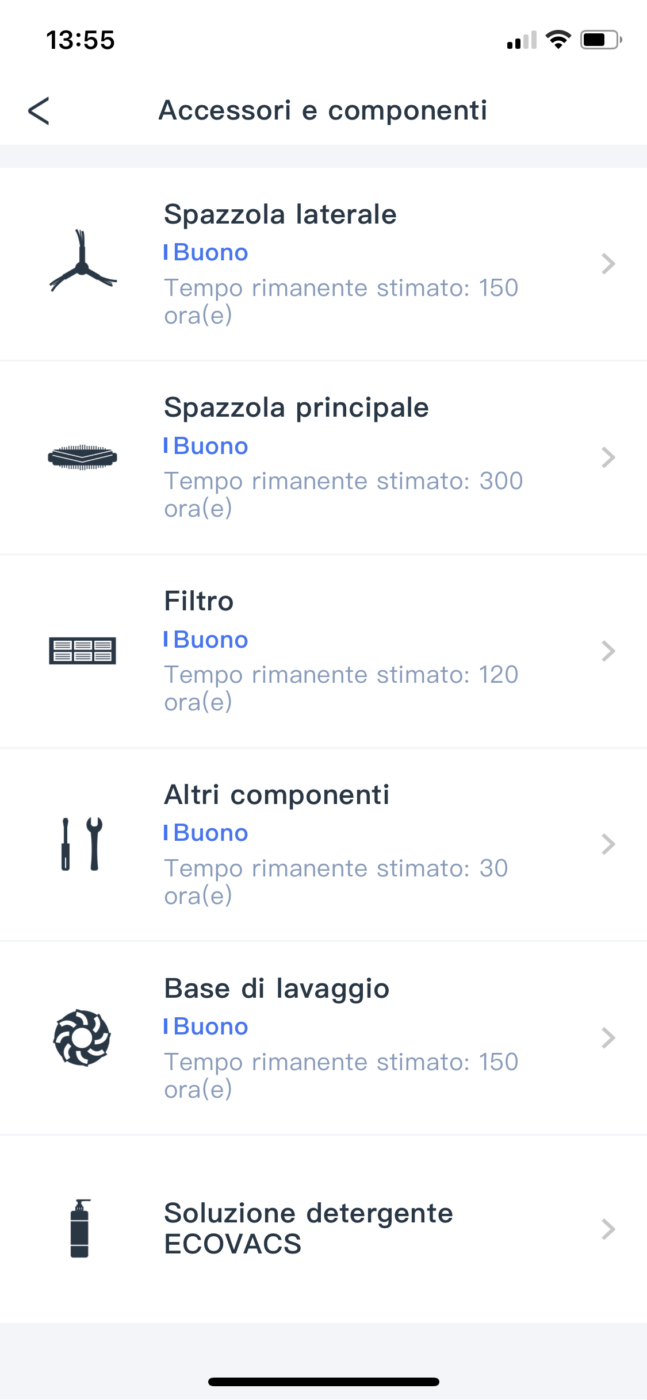 L’app permette anche di aggiornare il firmware del dispositivo, che viene migliorato continuamente (in particolare nei primi mesi di vita di ogni modello); non bisogna quindi stupirsi se l’app segnalerà la presenza di una nuova versione subito dopo aver concluso la configurazione. L’app consente anche di tenere sotto controllo lo stato dei componenti consumabili (dalle spazzole ai filtri), e di ordinare eventuali ricambi quando gli elementi originali dovessero usurarsi.